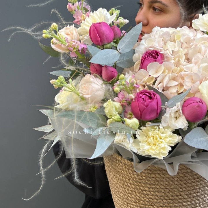 Цветочная корзина из пионов и пионовидных роз "Юниверсити"