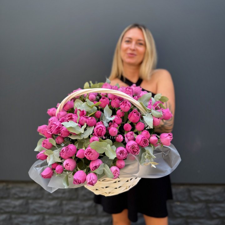 65 пионовидных кустовых роз в корзине
