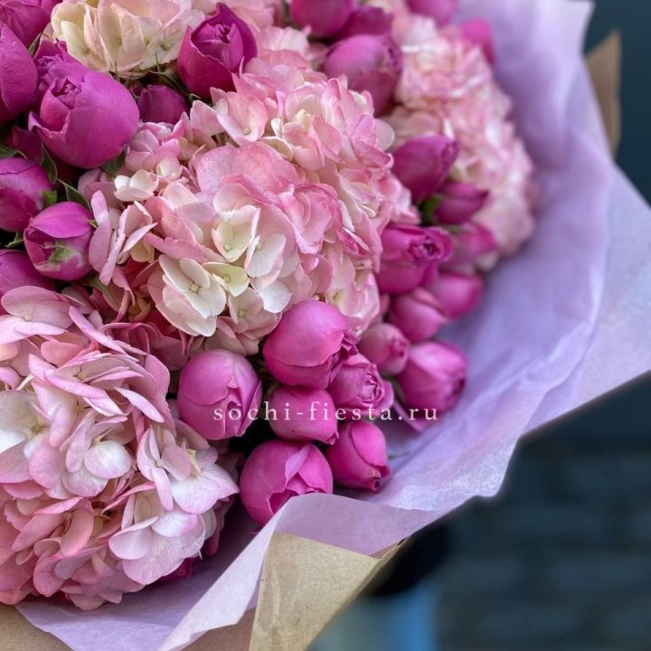 Букет белых гортензий и пионовидных роз