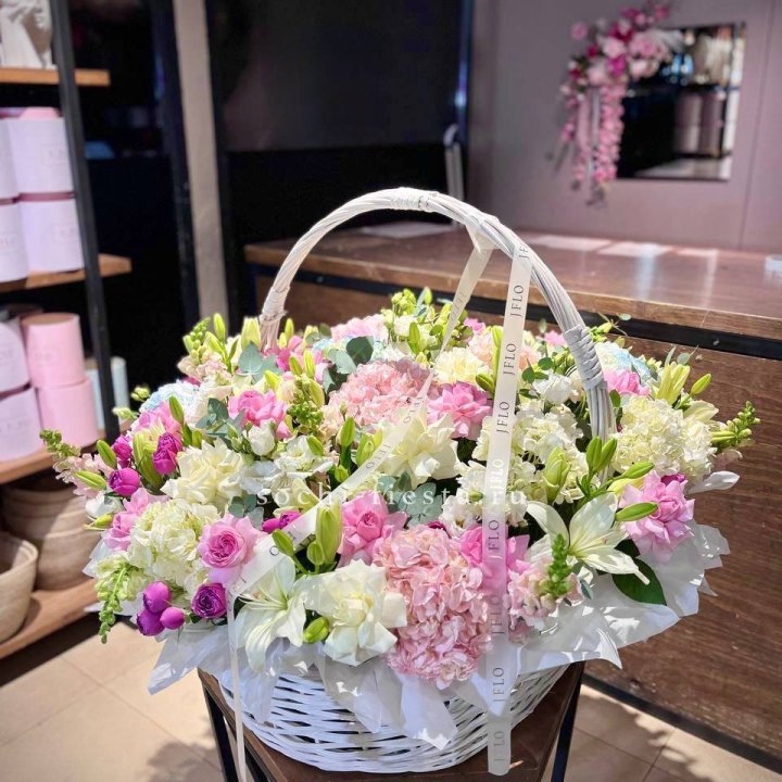 Цветочная корзина из пионов и пионовидных роз "Юниверсити"