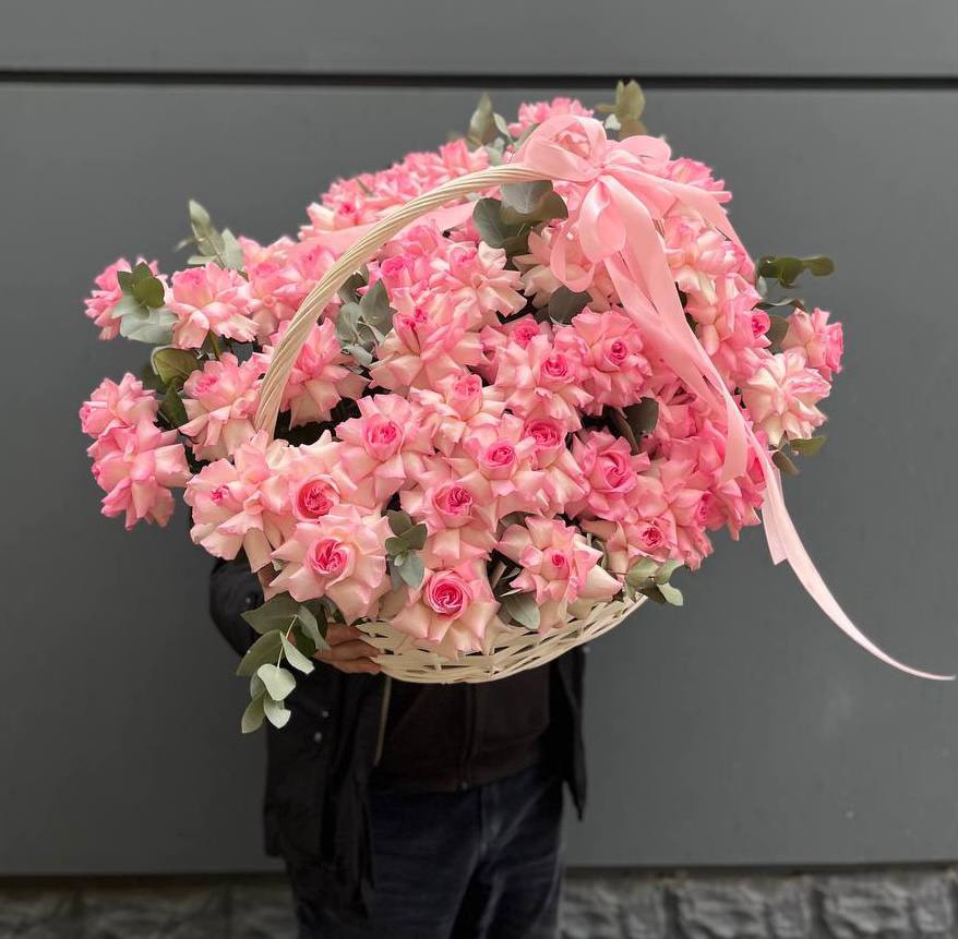51 розовая роза в корзине