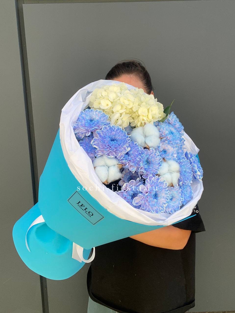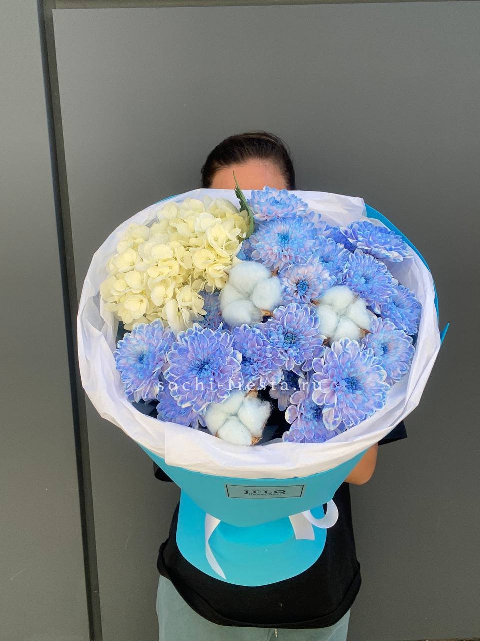Авторский букет в составе которого: протея, кустовые розы, одноголовые розы, альстромерии, перья, амарант, лента и дизайнерская пленка.