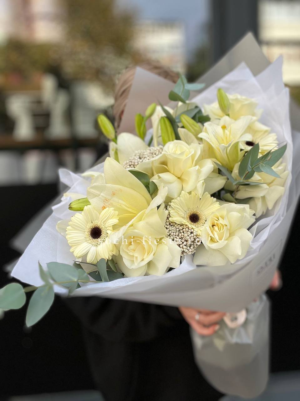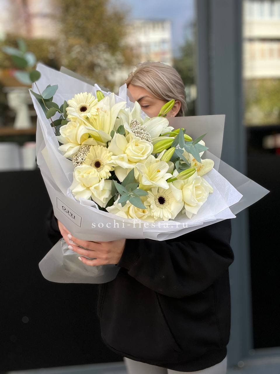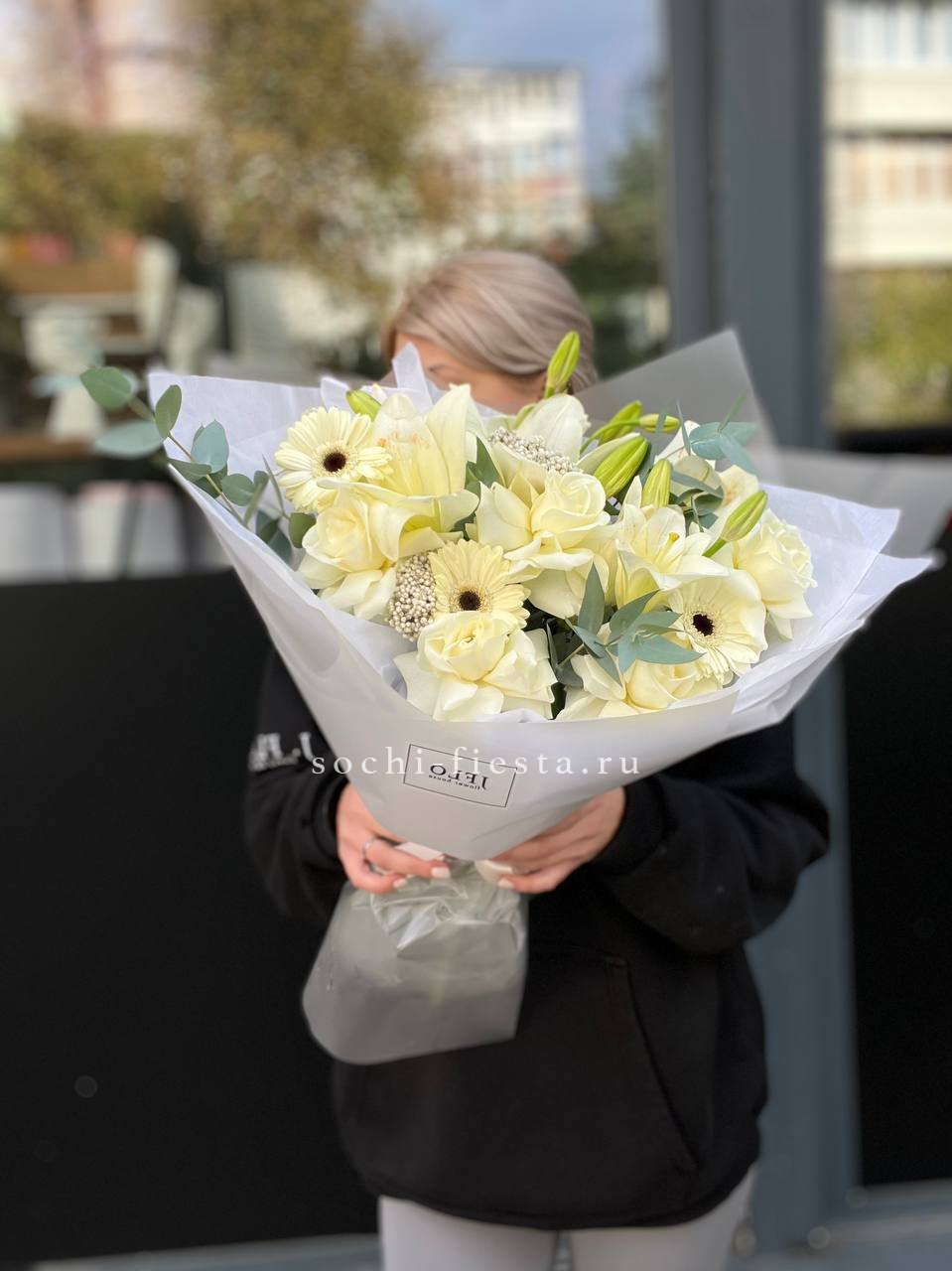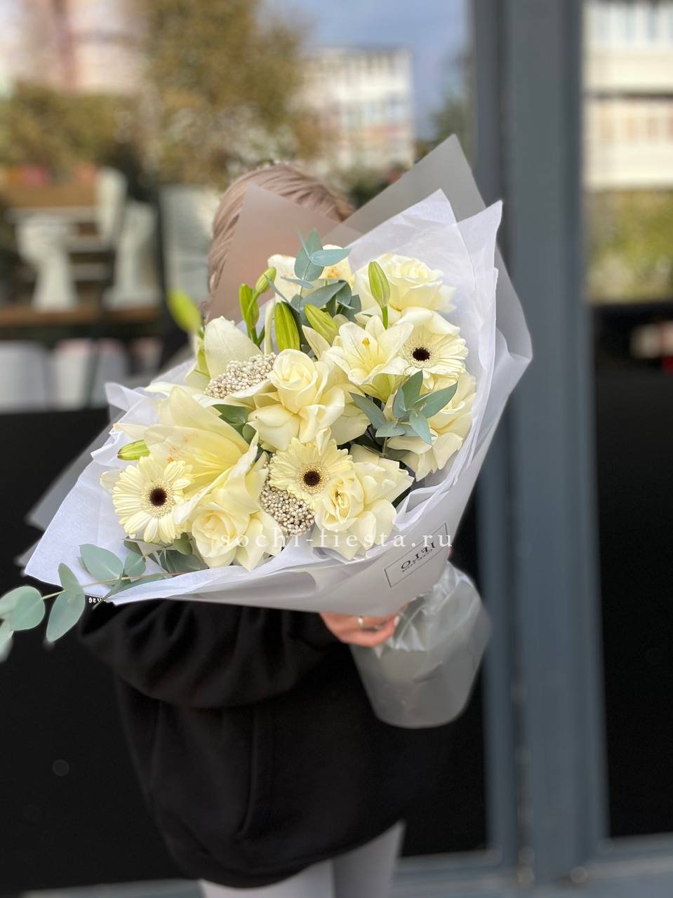 Состав: гербера, роза, лилия, озатамус, эвкалипт, упаковка