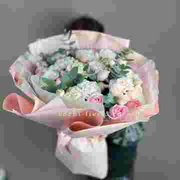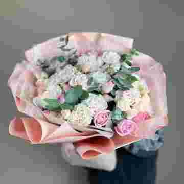 Состав: розовые розы, альстромерия, кустовые розы спрей, лента, упаковка на выбор