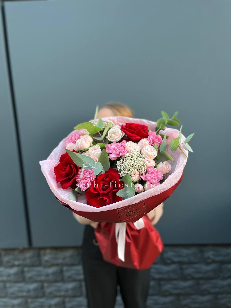Состав: красная француская роза, диантусы, бомбастик, озатамус, эвкалипт, упаковка