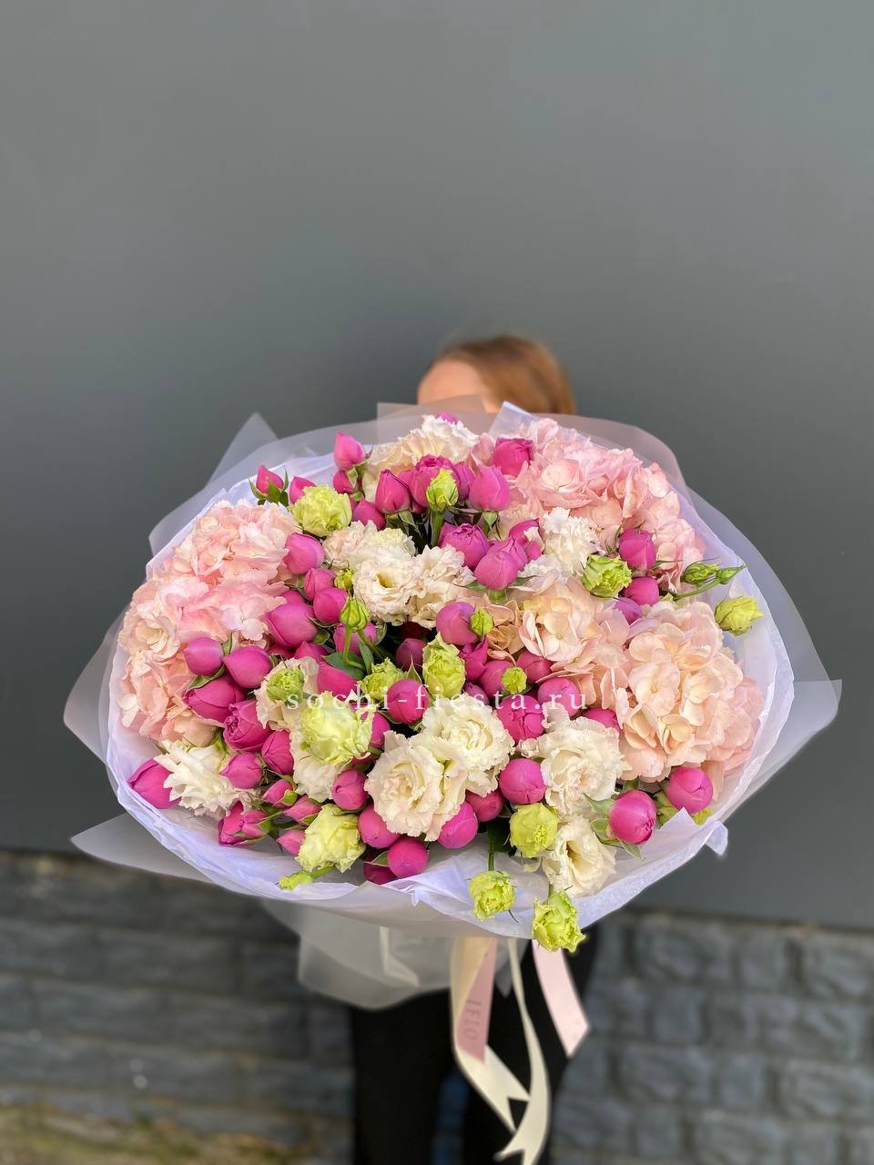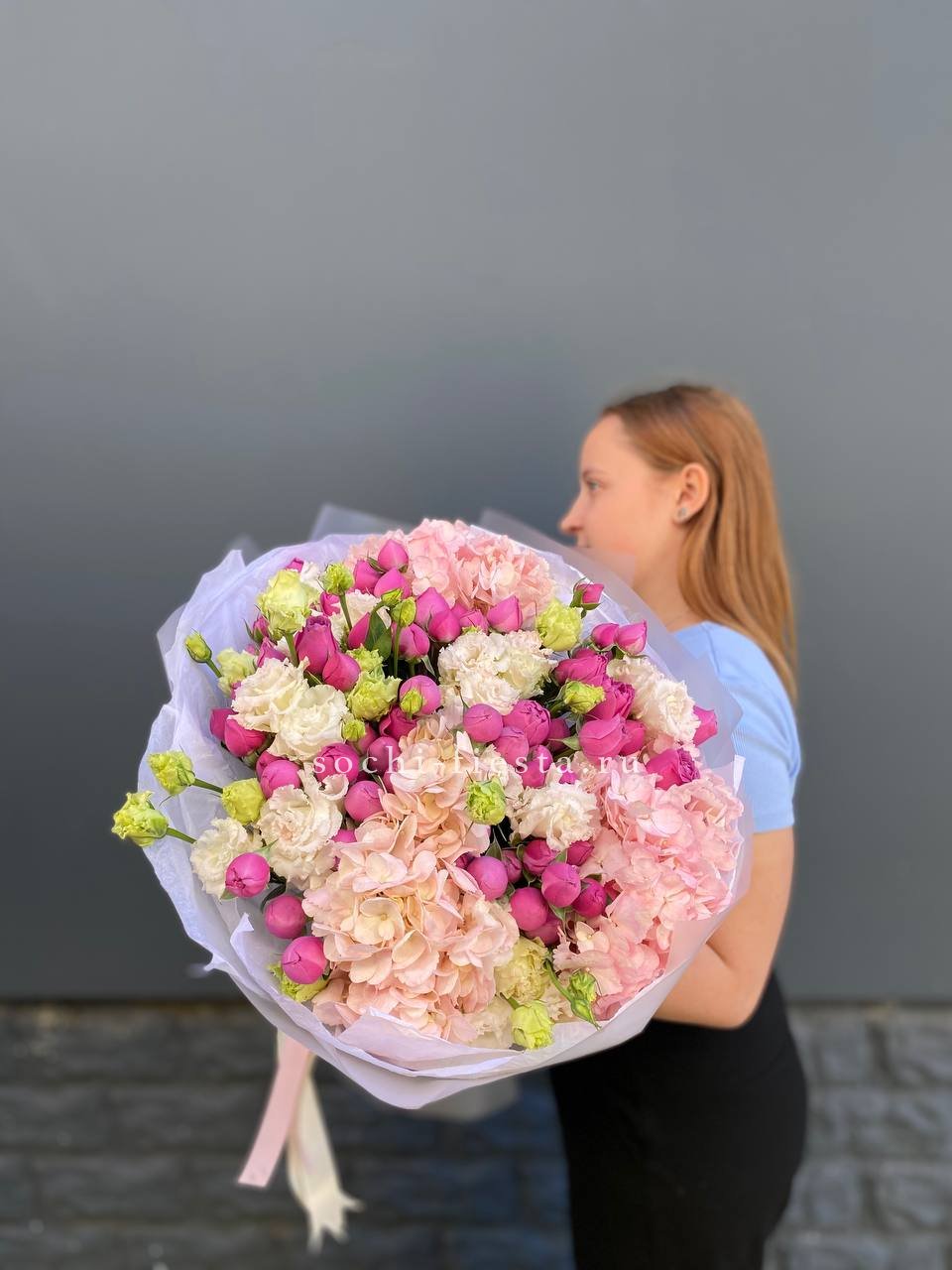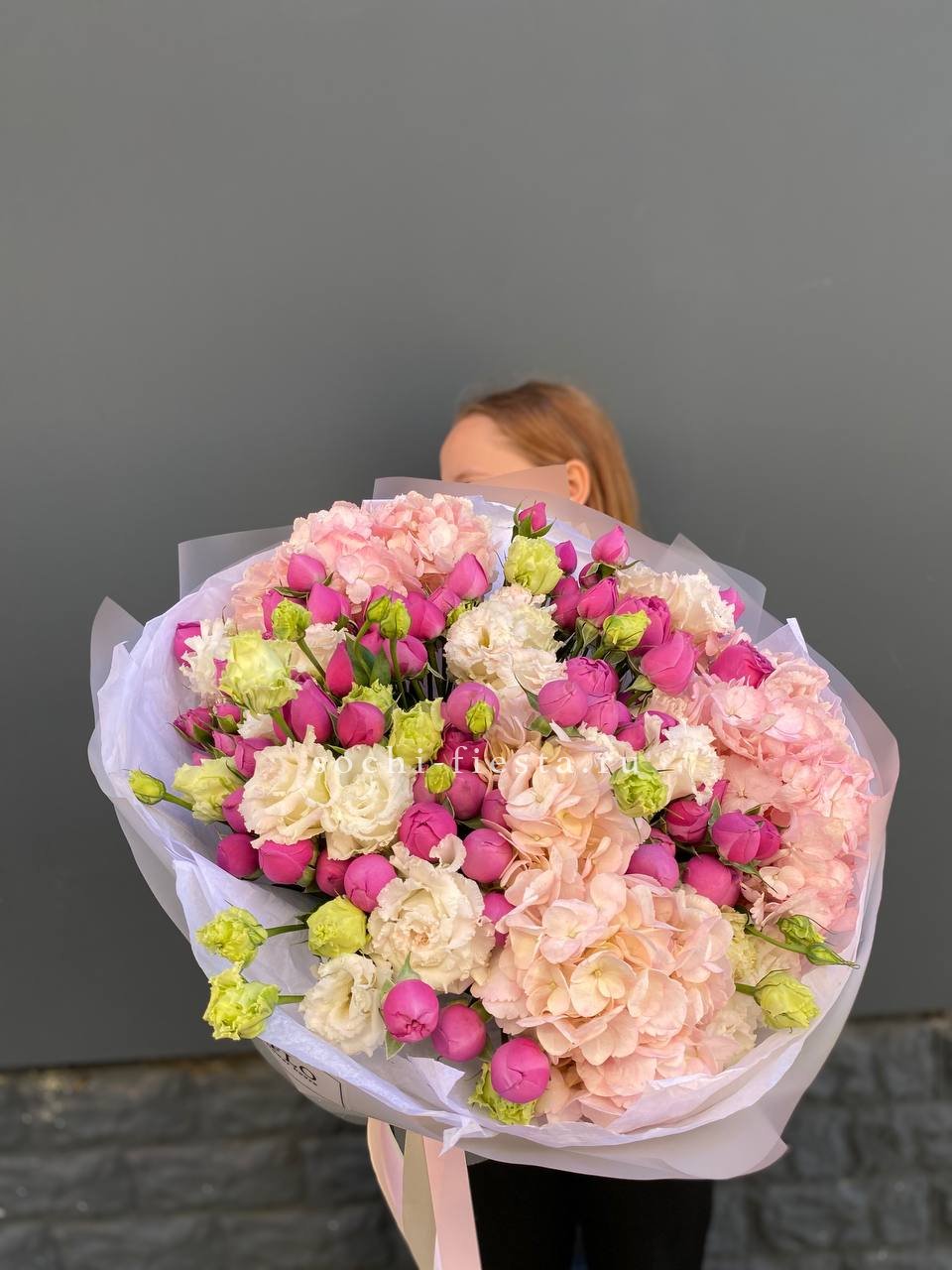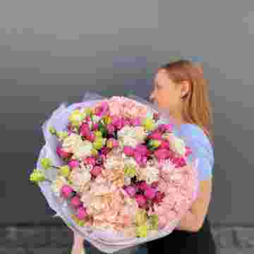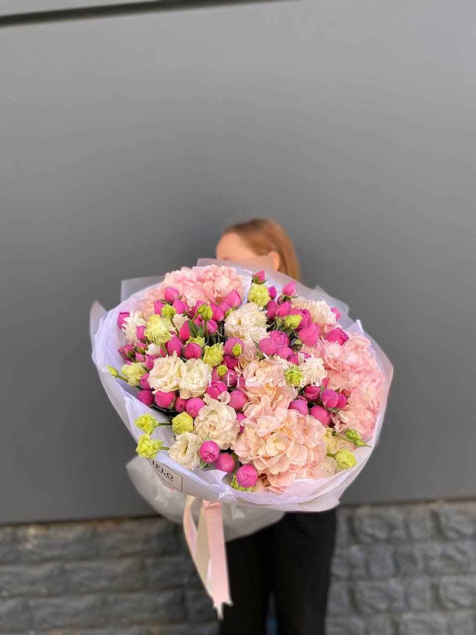 Состав: мисти баблс, гортензия, эустома, оформление.