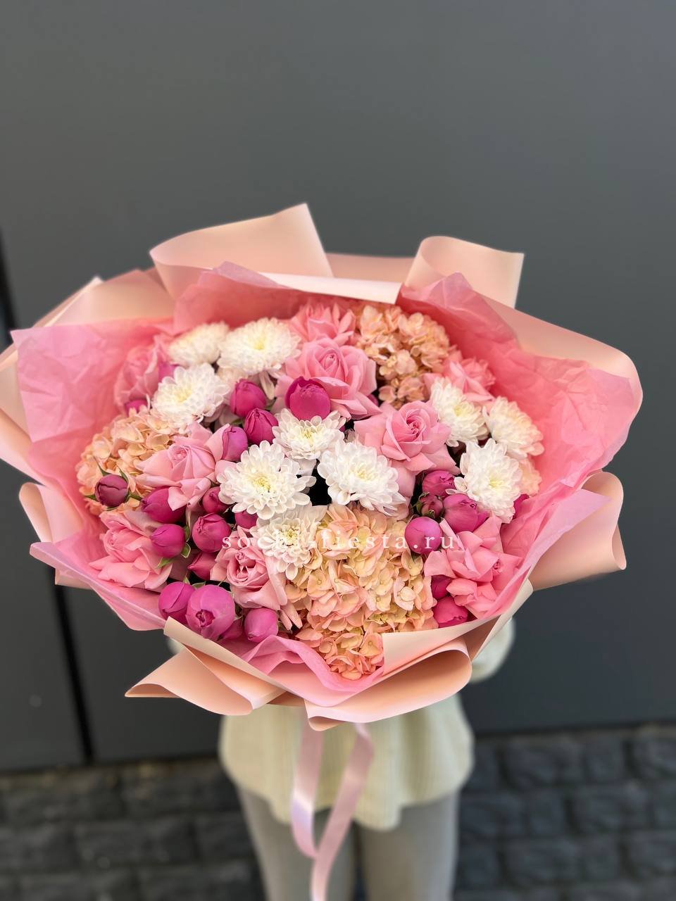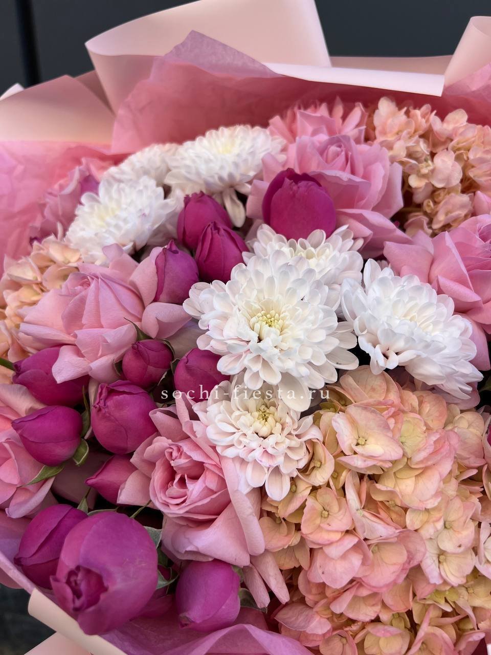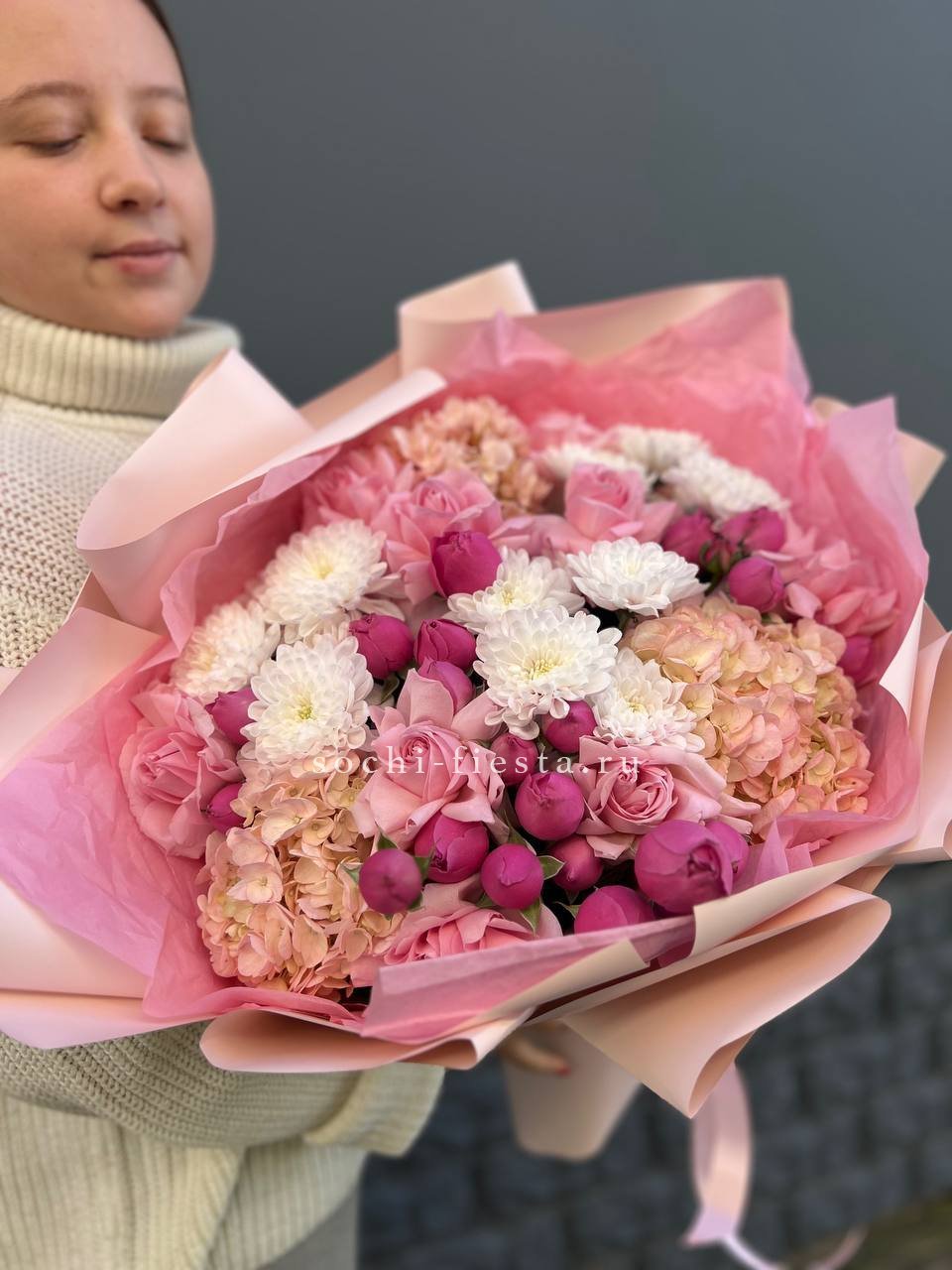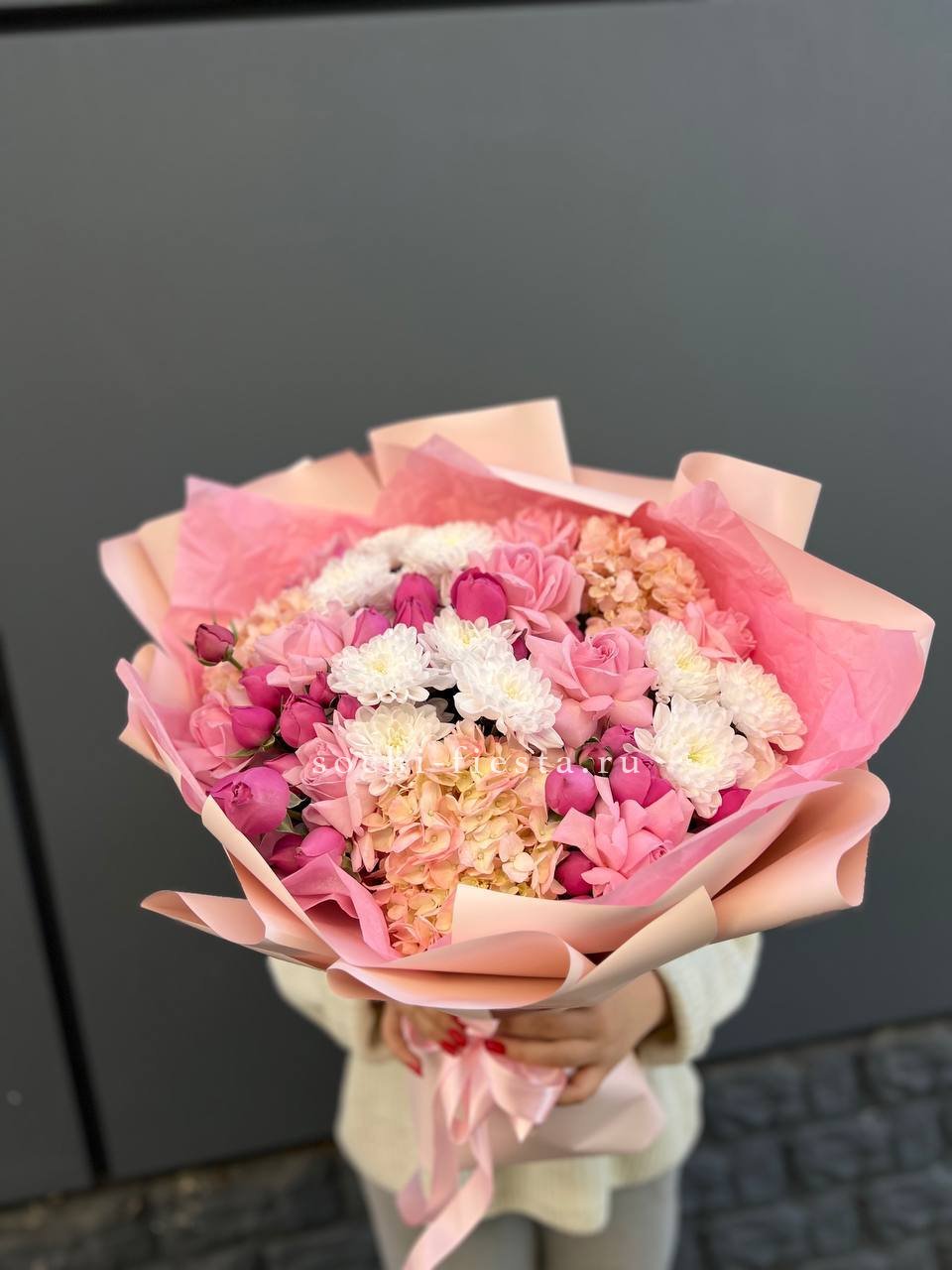Состав: хризантема кустовая, гортензия, мисти баблс, розы в нежном оформлении.
