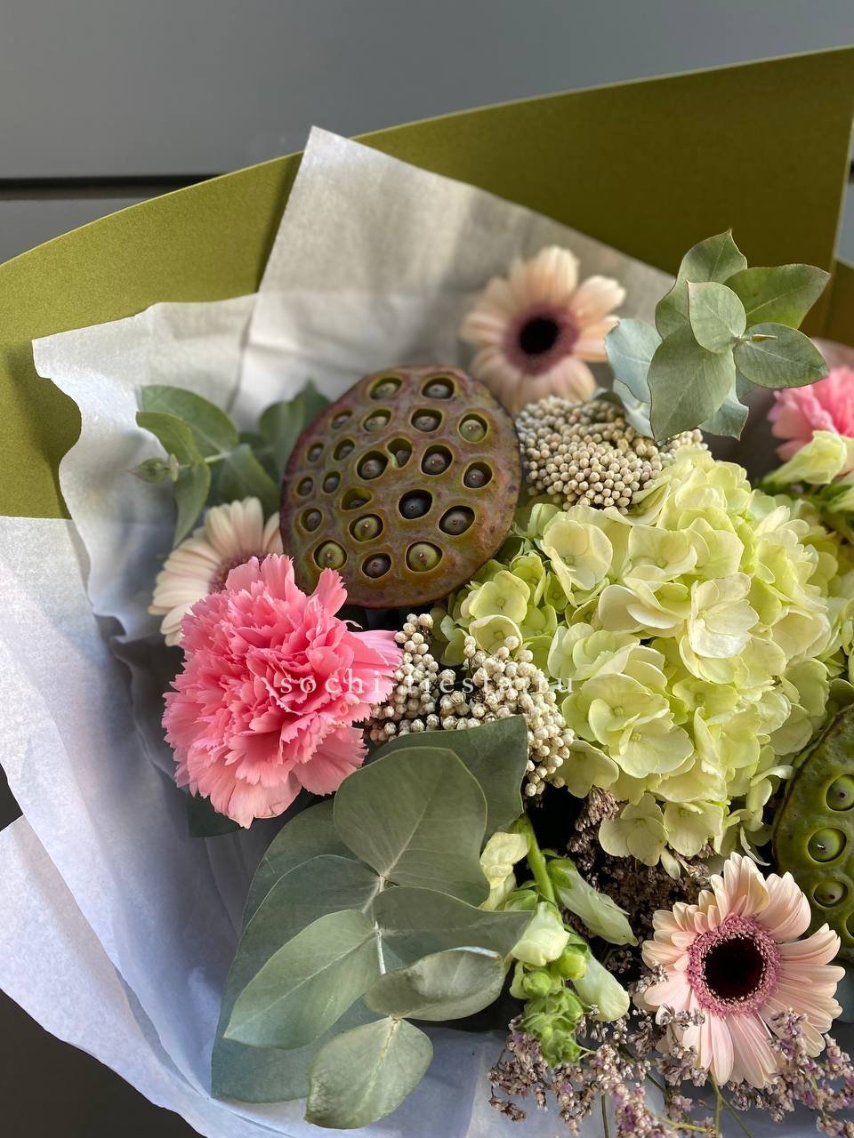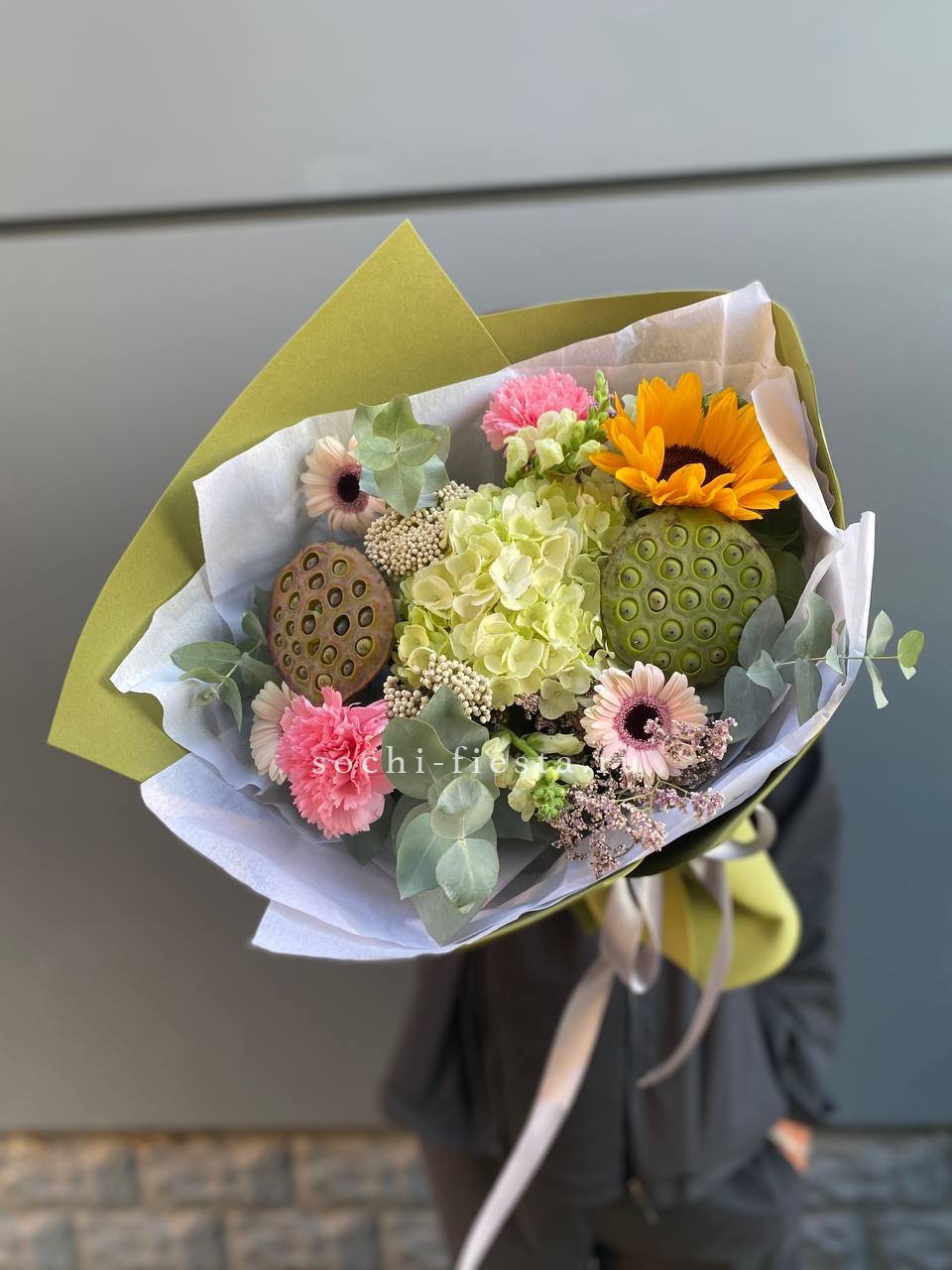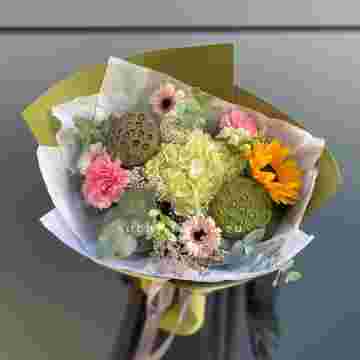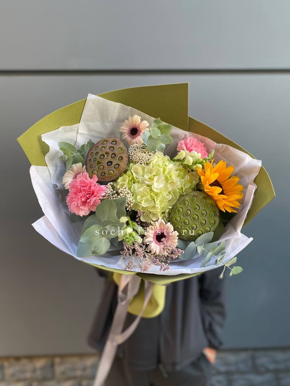 Состав: лотос, антирринум, диантус, подсолнух, озатамус, гортензия, гербера, лимониум, упаковка