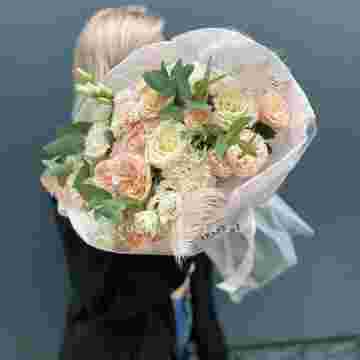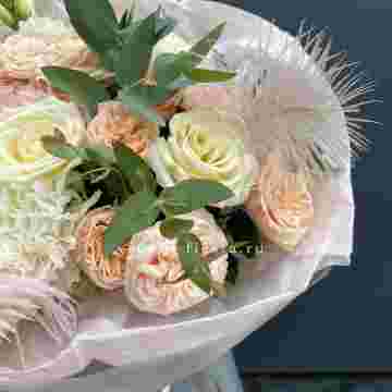 Состав: эвкалипт, гортензия, перо, кустовая роза, эустома, роза белая, диантус, упаковка