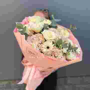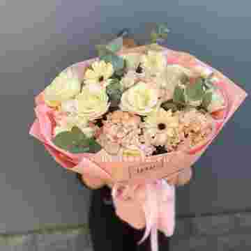 Сборный букет в составе которого гортензия, розовые розы, диантусы, эвкалипт,  лента, фоамиран