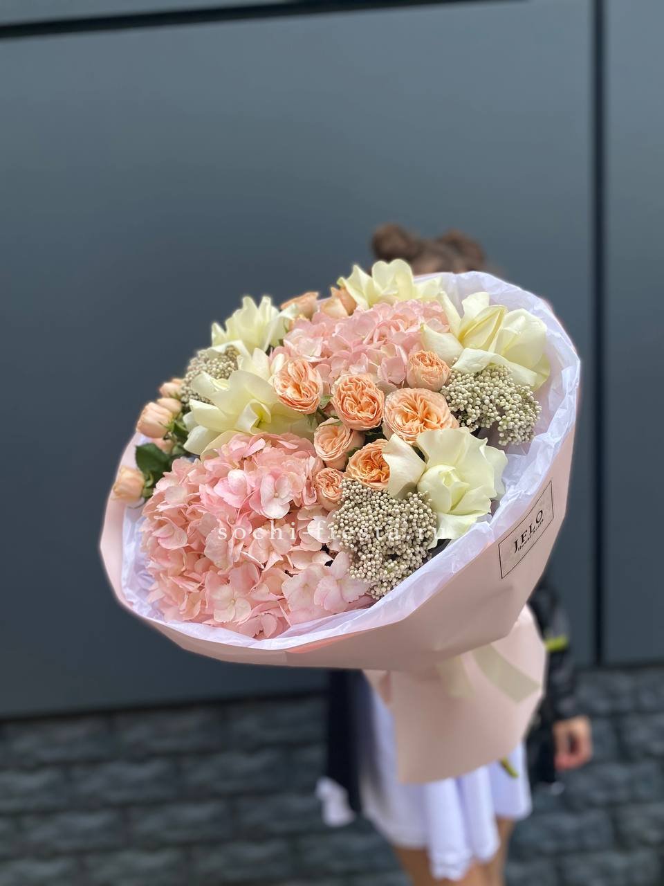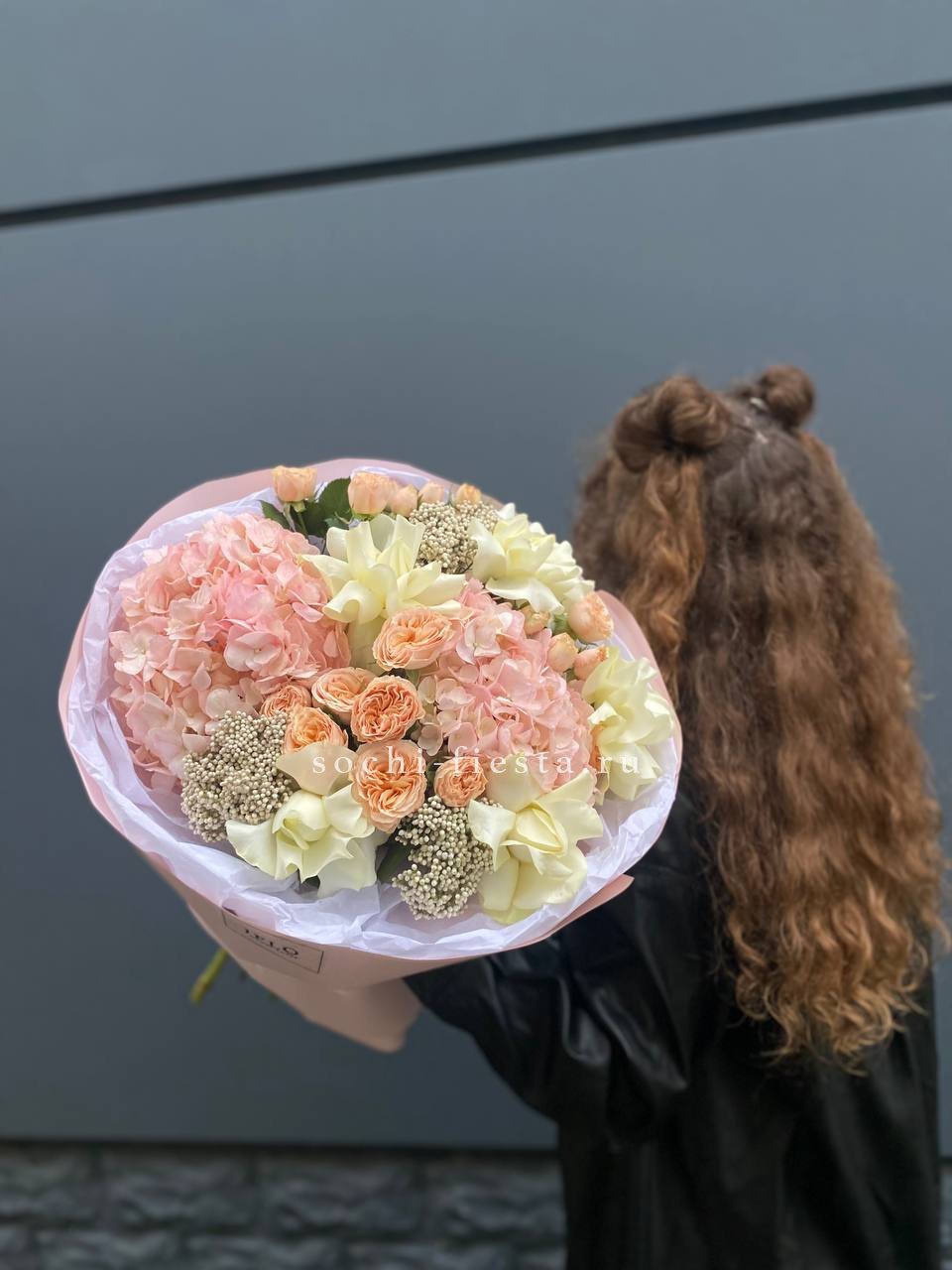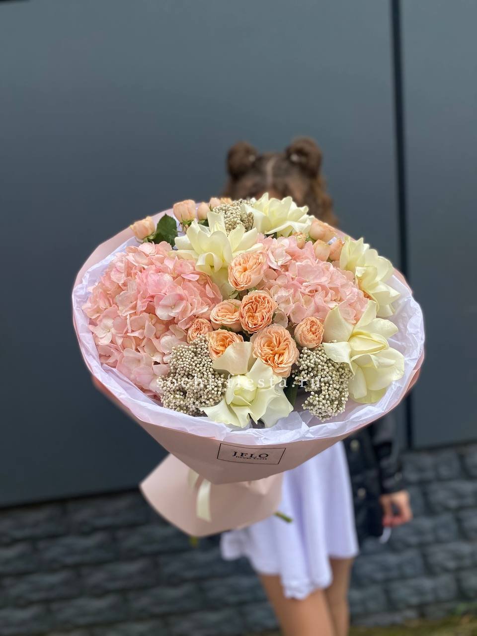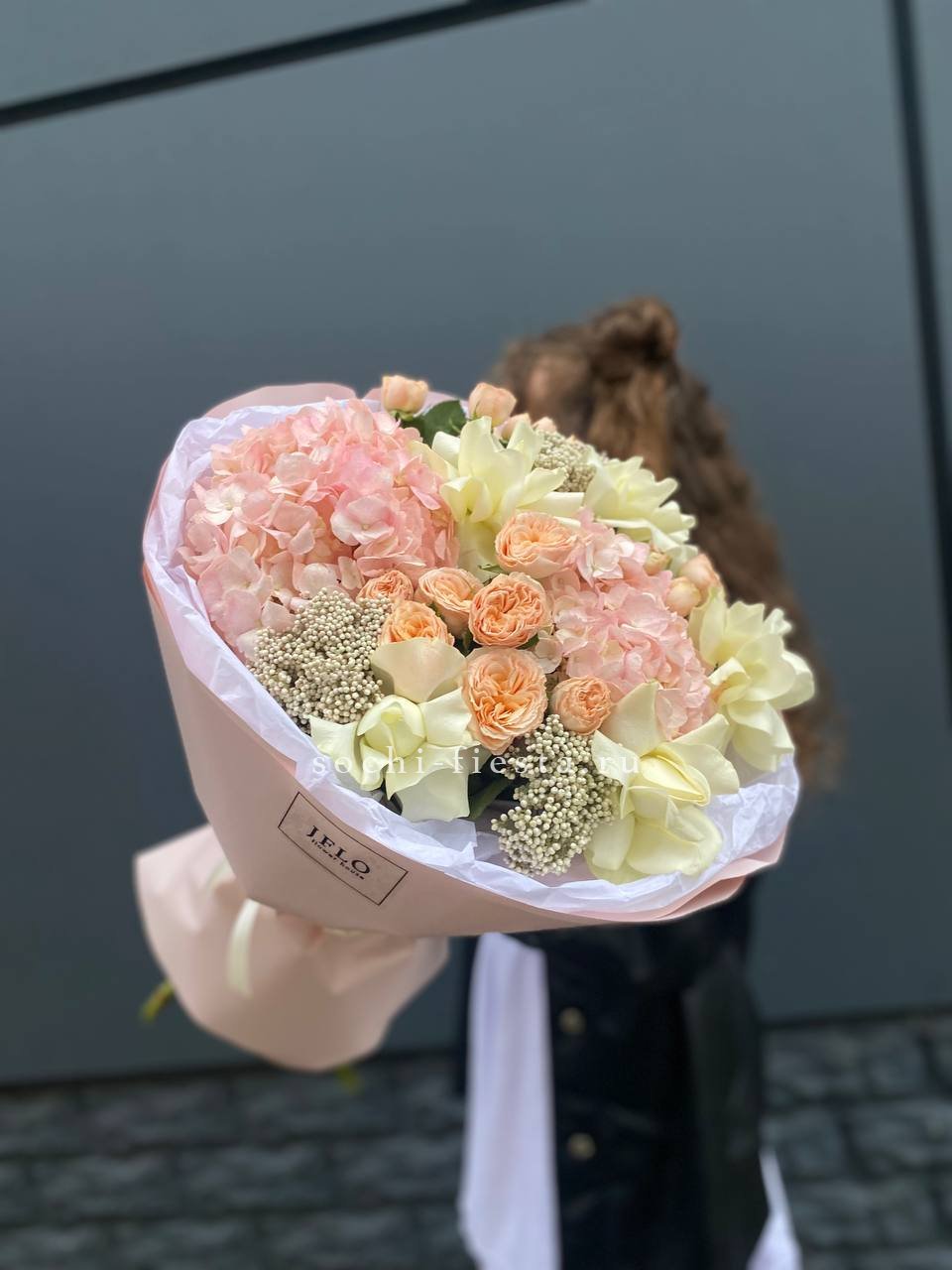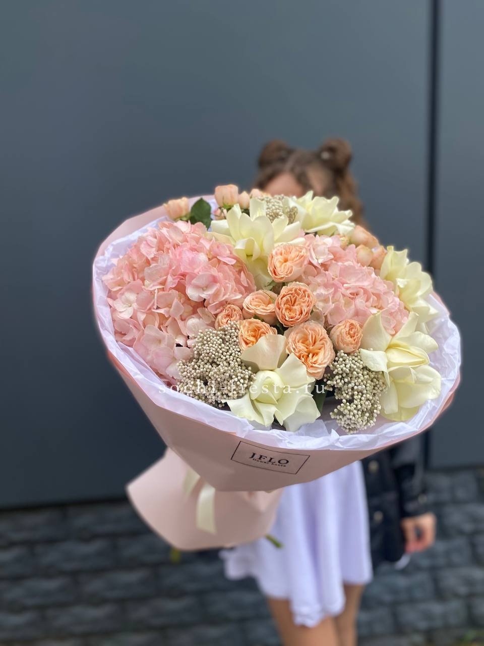 Состав: гортензия, пионовидная роза, озотамус, белая роза в нежном оформлении.
