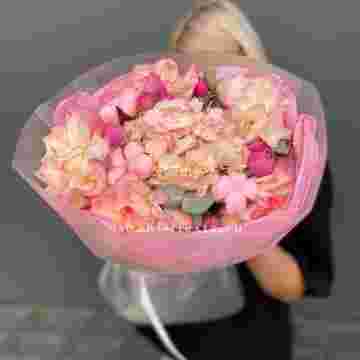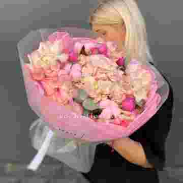 Состав: орхидея 3шт., гортензия 1шт., гербера 3шт., диантус 3шт., пионовидная роза бомбастик 1шт.,  эвкалипт, лента, дизайнерская пленка