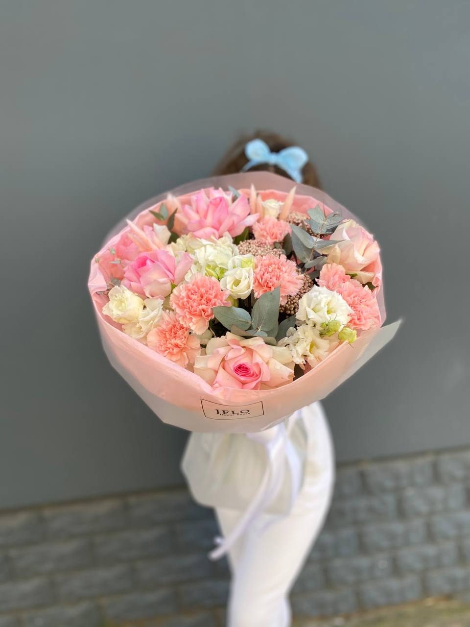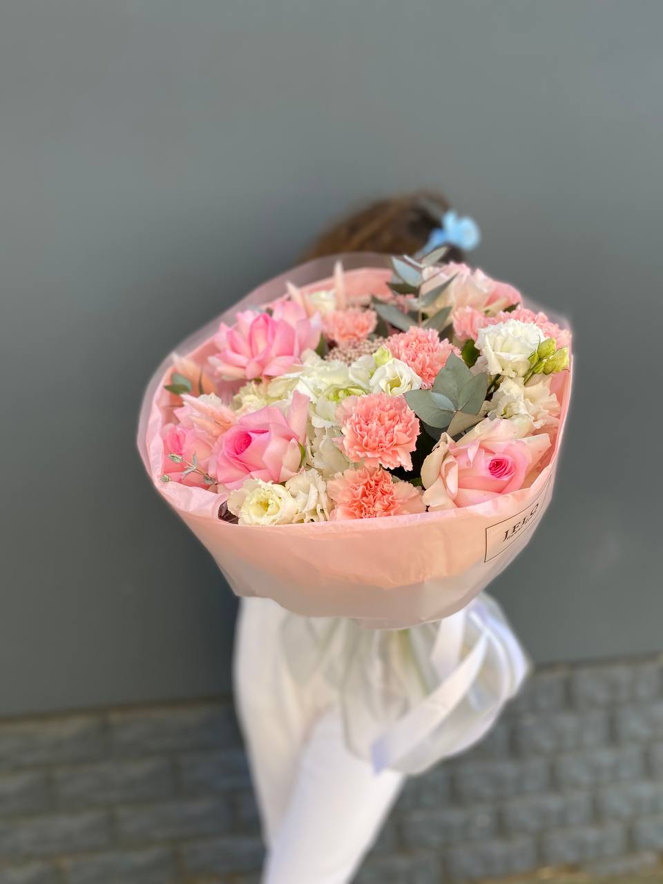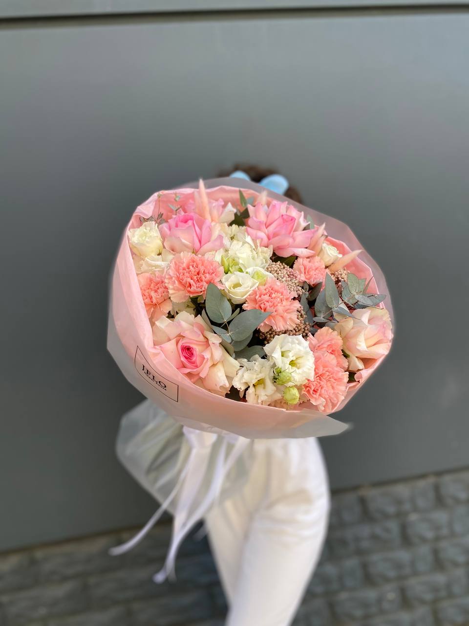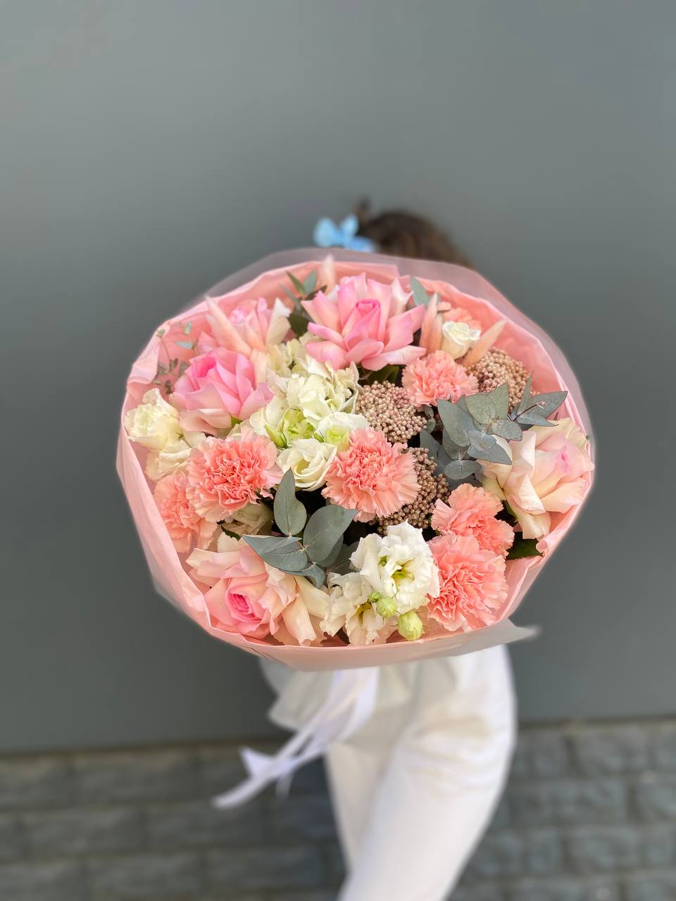 диантус, эустома, гортензия, хайди, эвкалипт, озатамус, пленка.
