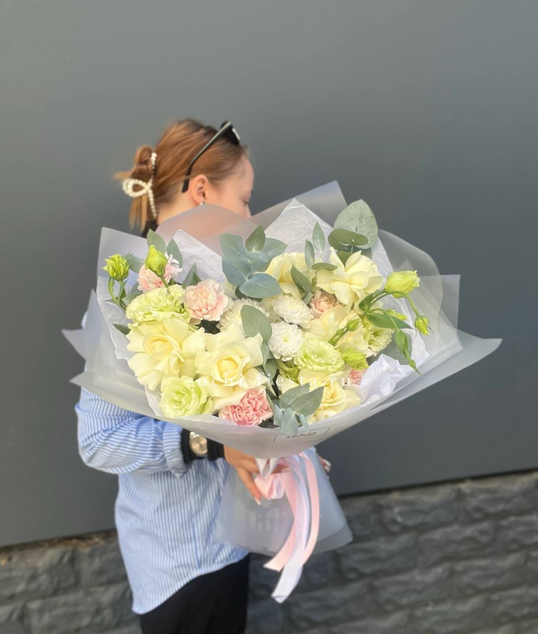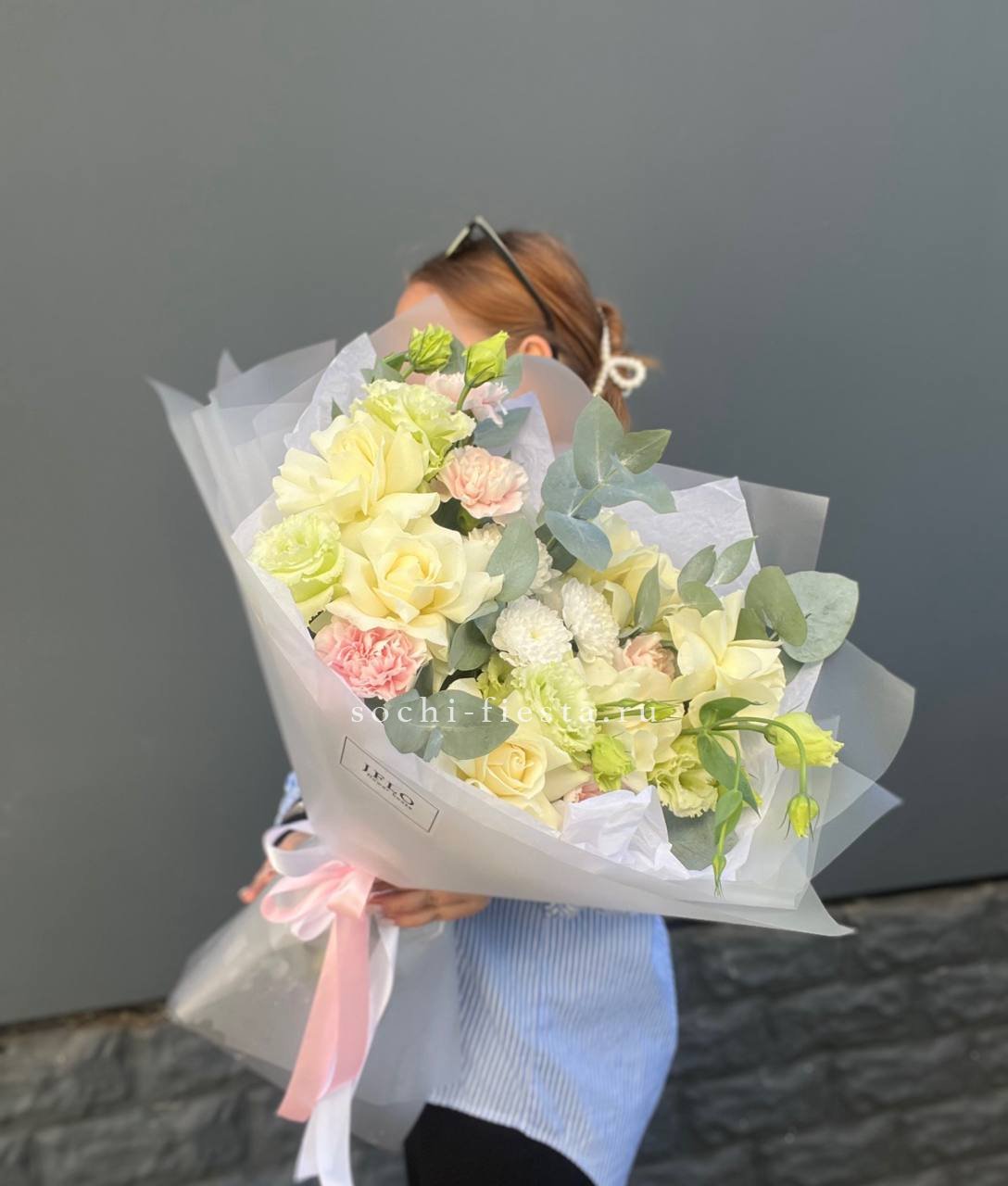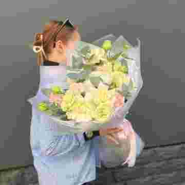 Состав: диантус, эустома, хризантема, белая роза, эвкалипт, упаковка