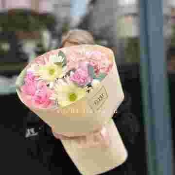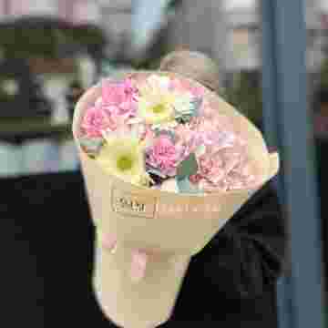 Состав: сирень, кустовые пионовидные розы, тишью, пленка, лента.