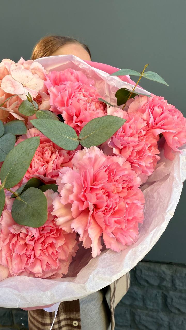 диантусы, гортензия, эвкалипт, пленка.