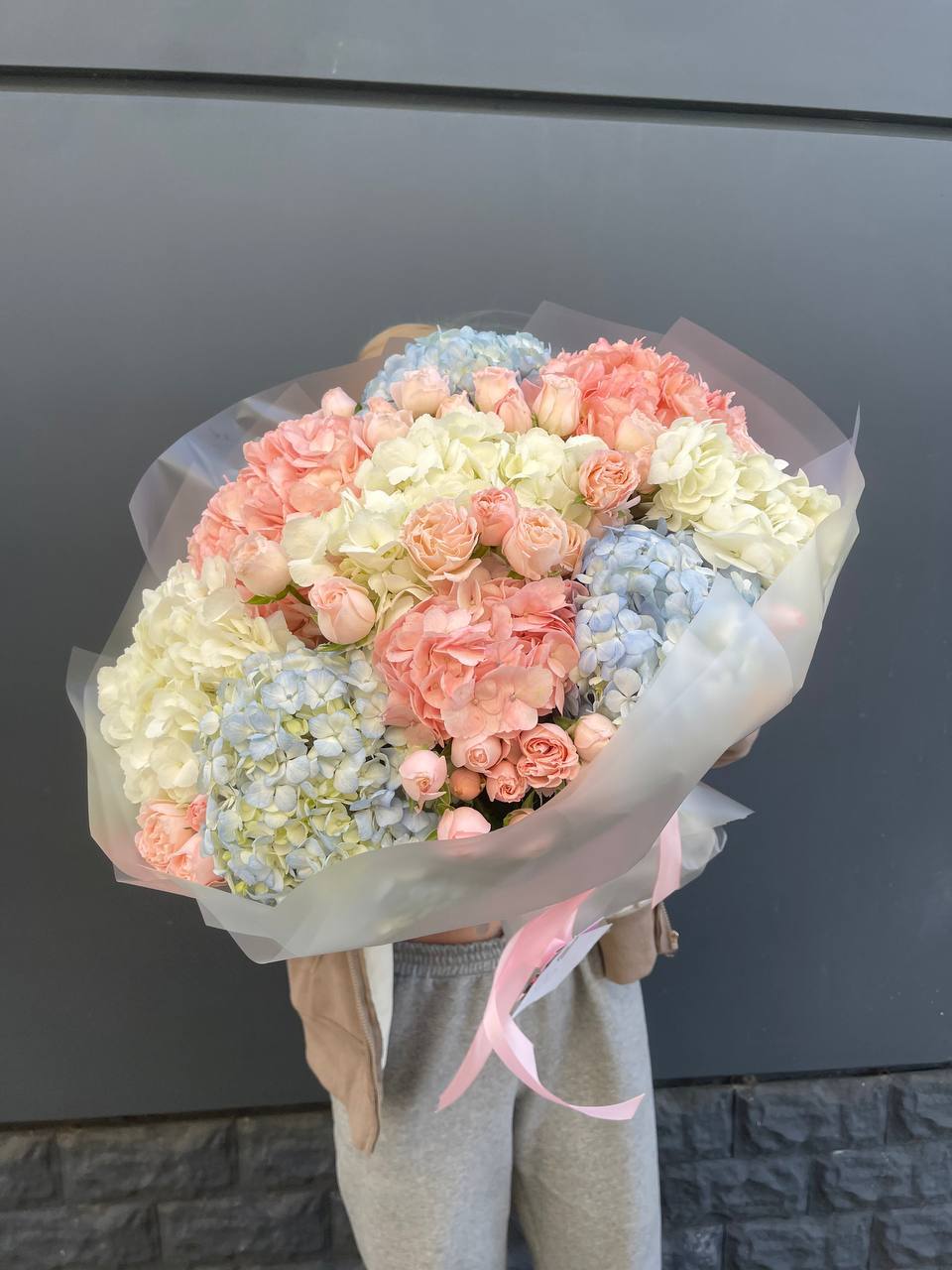 Этот пышный авторский букет напоминает нежное зефирное облако, в котором гармонично сочетаются объемные формы и изысканные оттенки. Композиция представляет собой микс из крупных соцветий гортензии и кустовых роз в пастельной гамме.