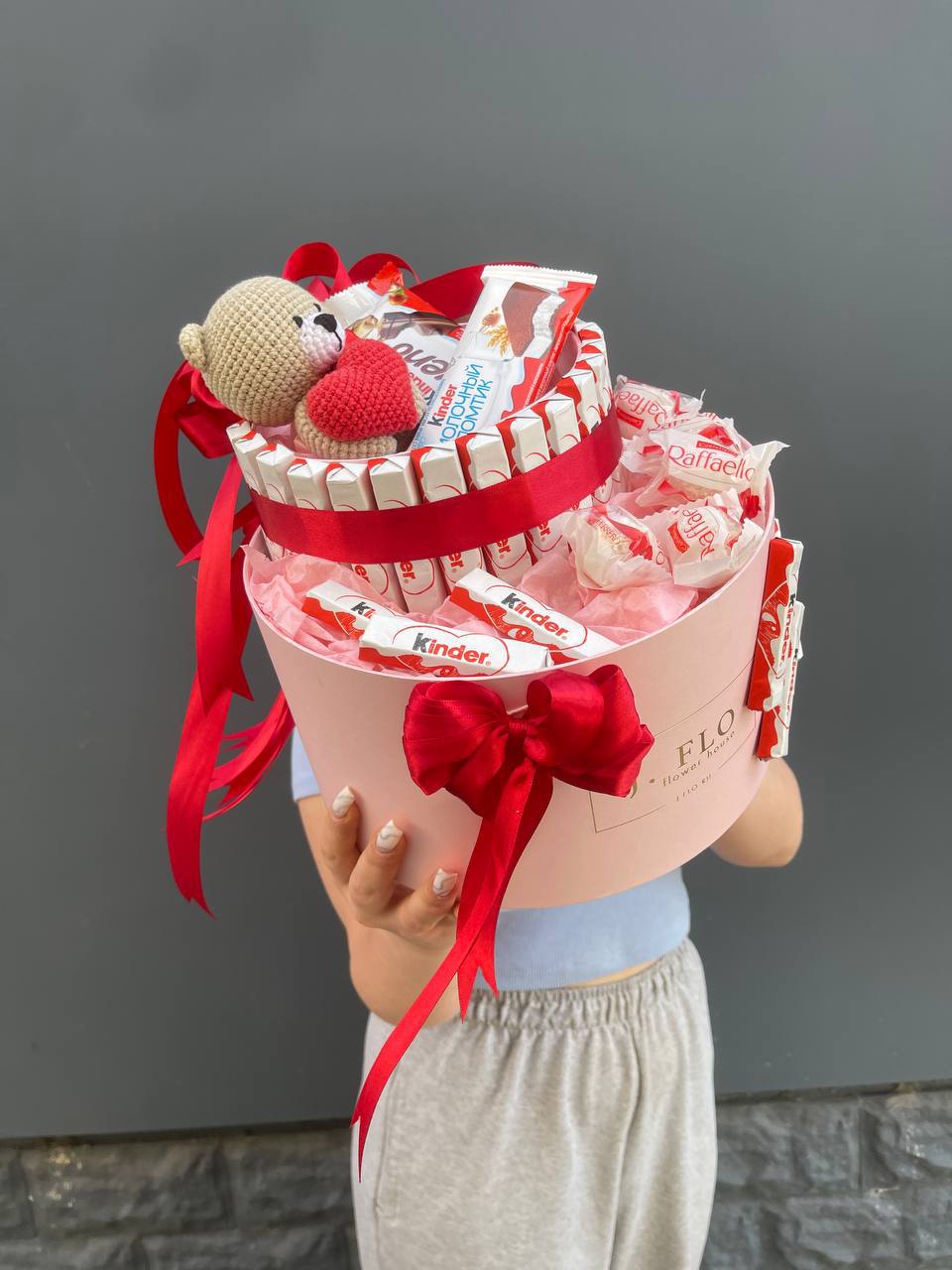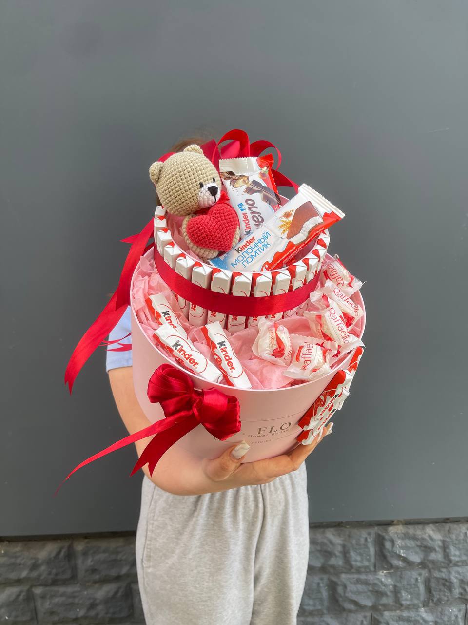 Kinder шоколад- 4 уп., Kinder Bueno- 1 шт., молочный ломтик-1, Raffaello-5, наполнитель, цилиндр-2, медведь.