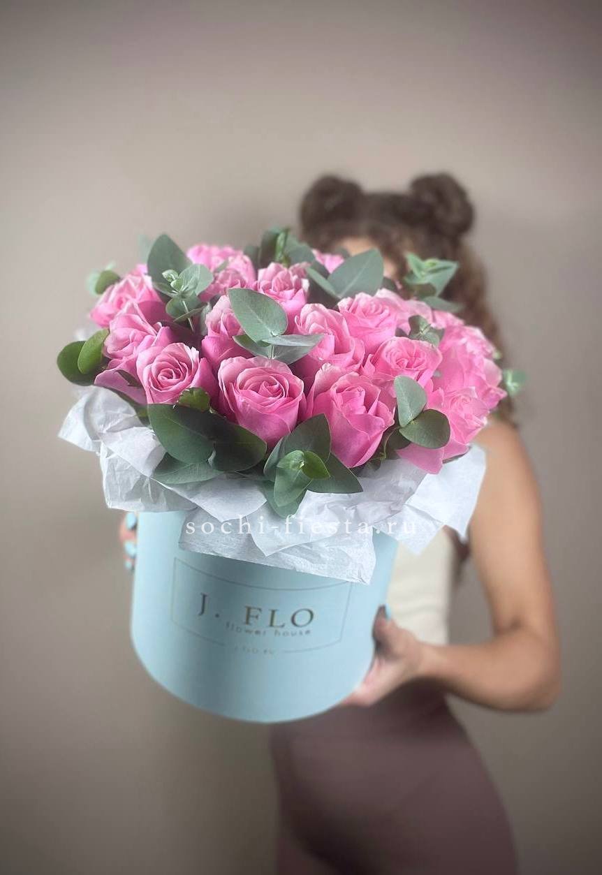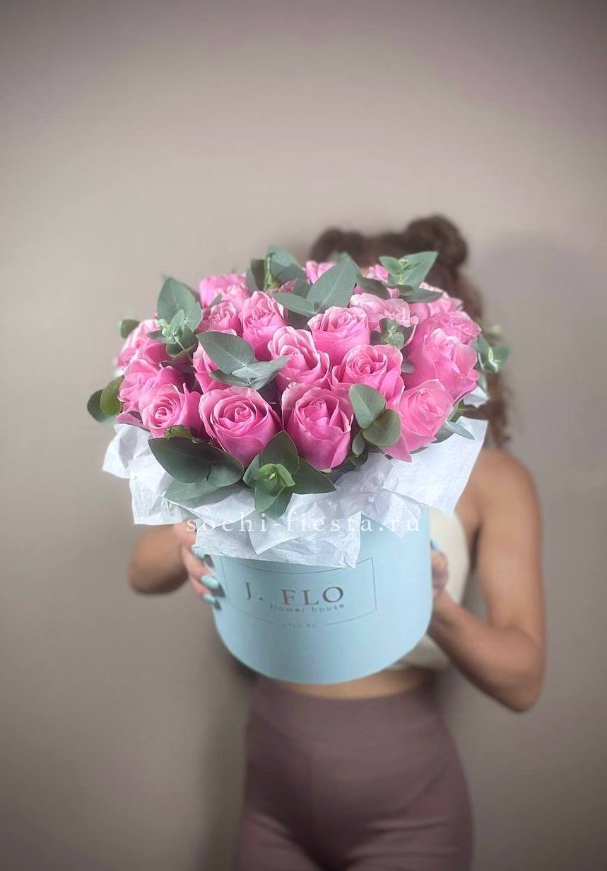 Состав на фото 27 розовых роз в шляпной коробке с эвкалиптом.