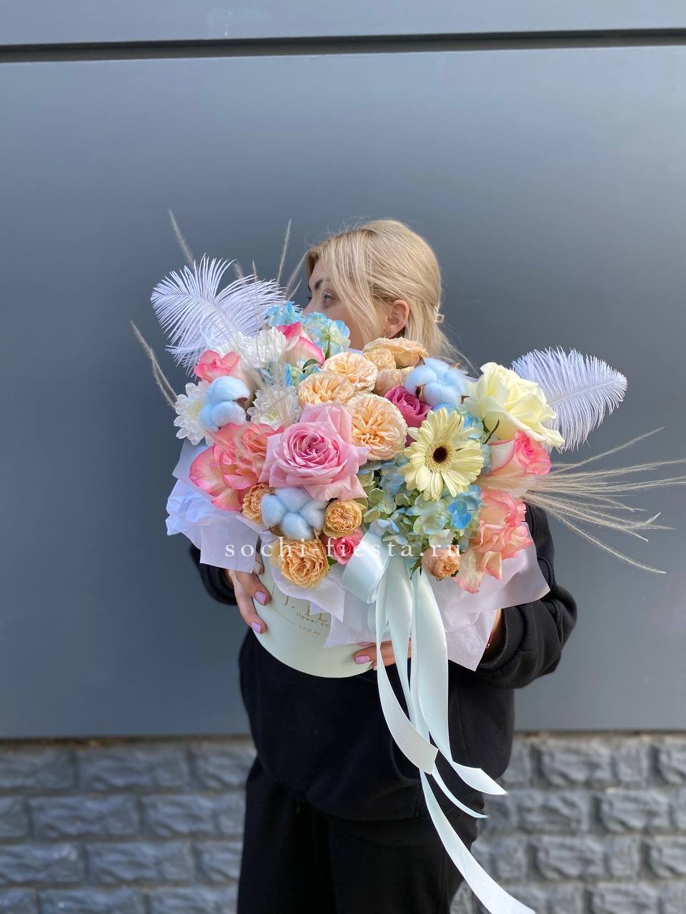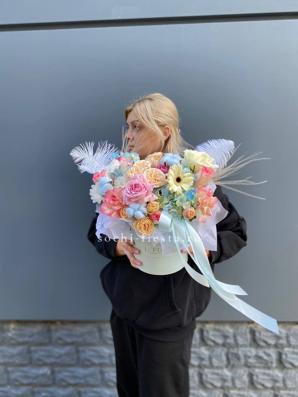 Состав: бокс из нежных розово-голубых цветов, розы, герберы, гортензии.