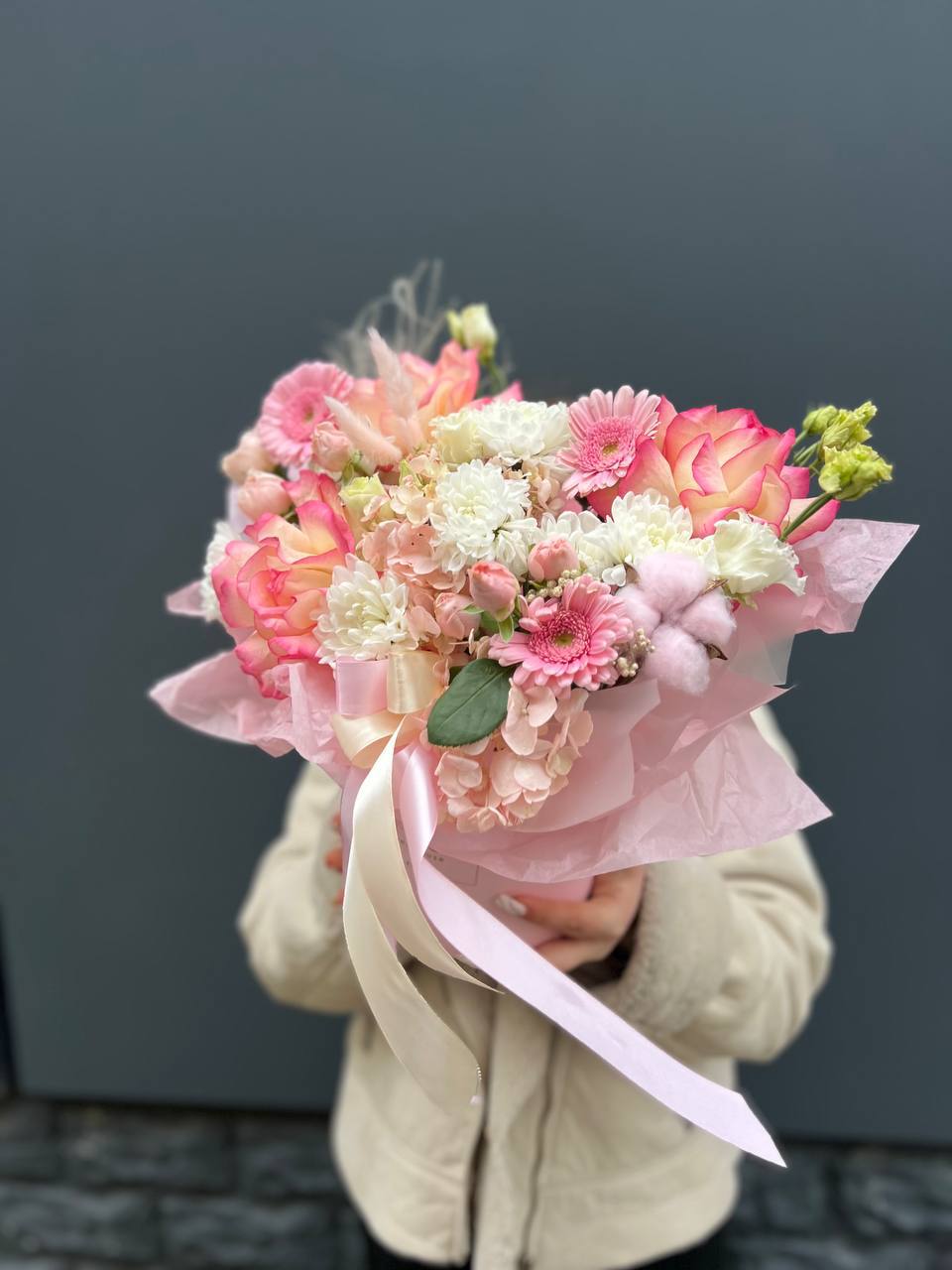 Состав: гортензия, эустома, хризантема, бомбастик, хлопок, джумилия, герберы, бокс 16, оазис.