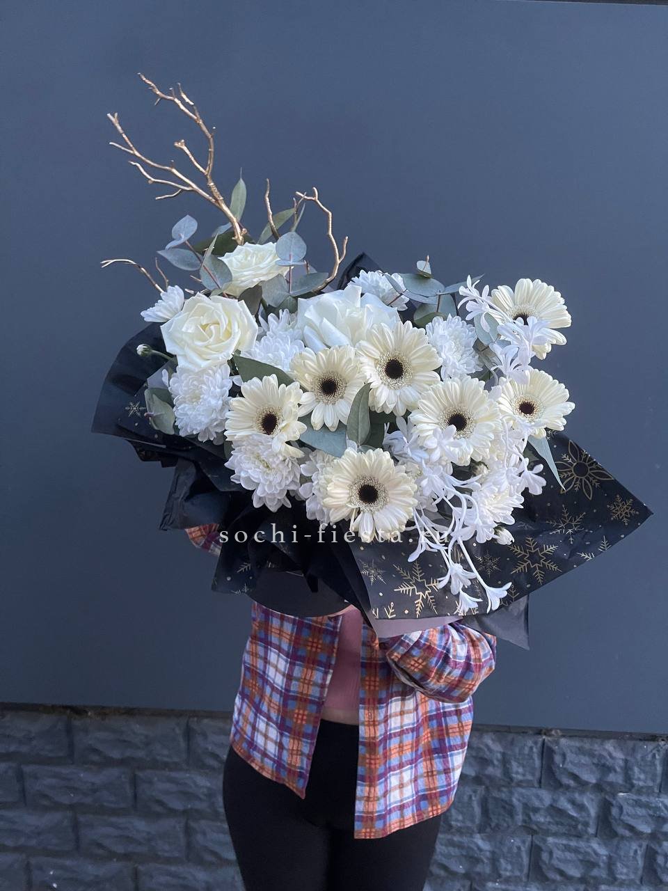 Состав: герберы, хризантемы, белые розы, бокс 16 с элементами декора