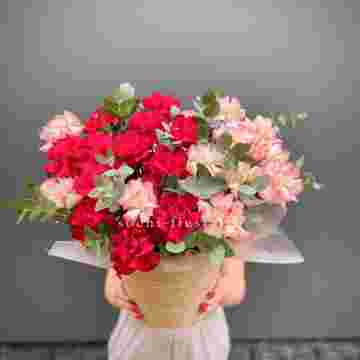 Состав: гортензии, пионы,кустовые пионовидные розы, амарант, цилиндр D 20,  бумага тишью.