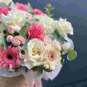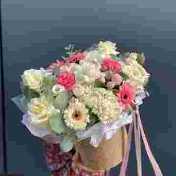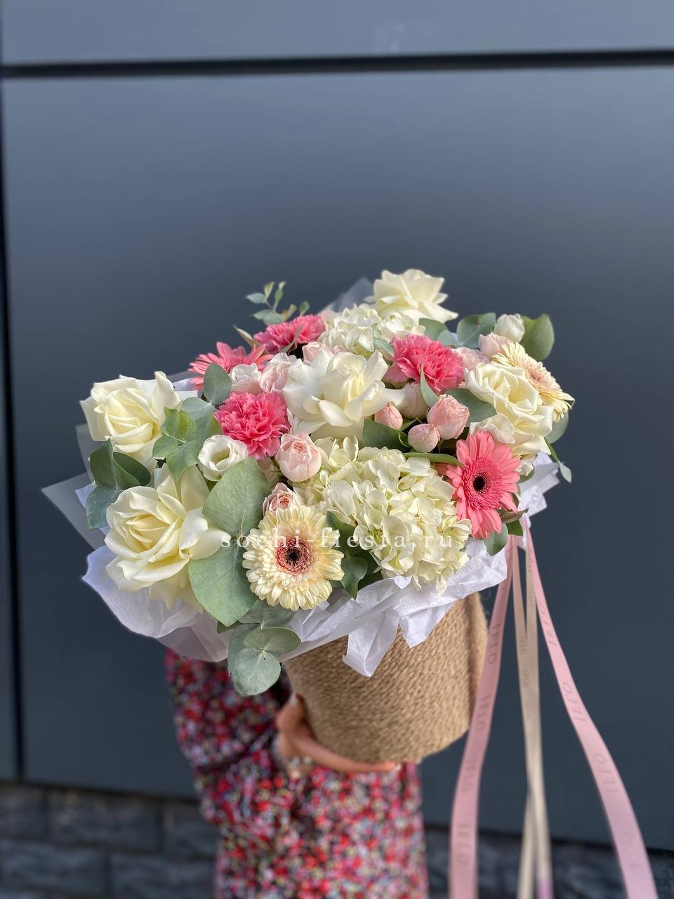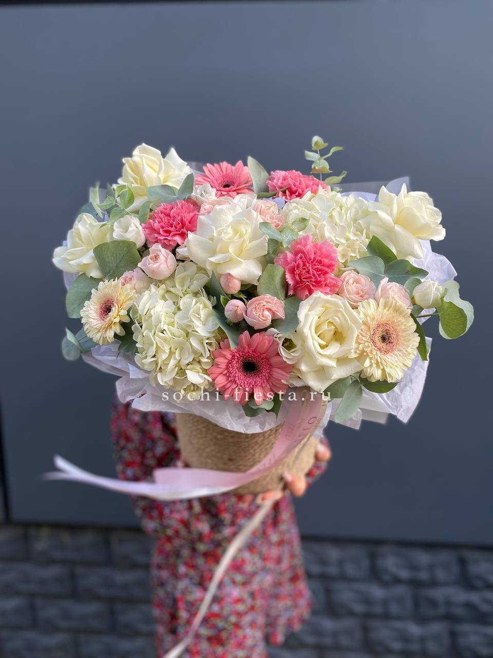 Состав: гербера, розы, диантус, бомбастик, гортензия, эустома, эвкалипт, джутовое кашпо