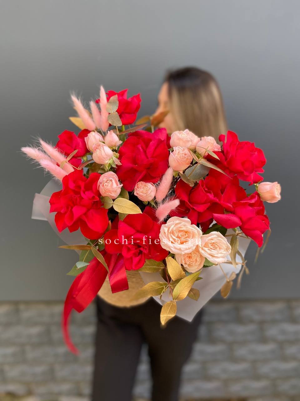 Состав: красная роза, бомбастик, лагурус, золотой эвкалипт, джутовое кашпо