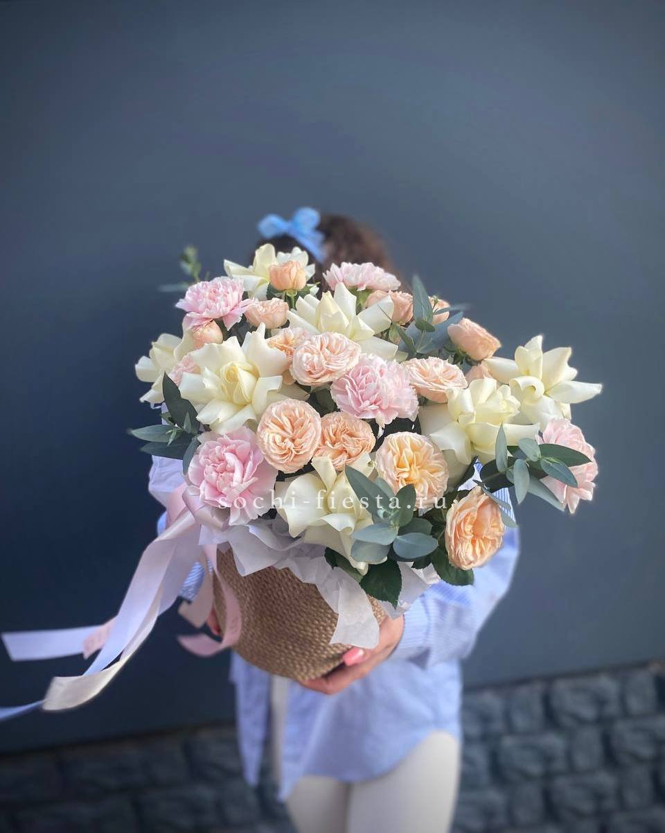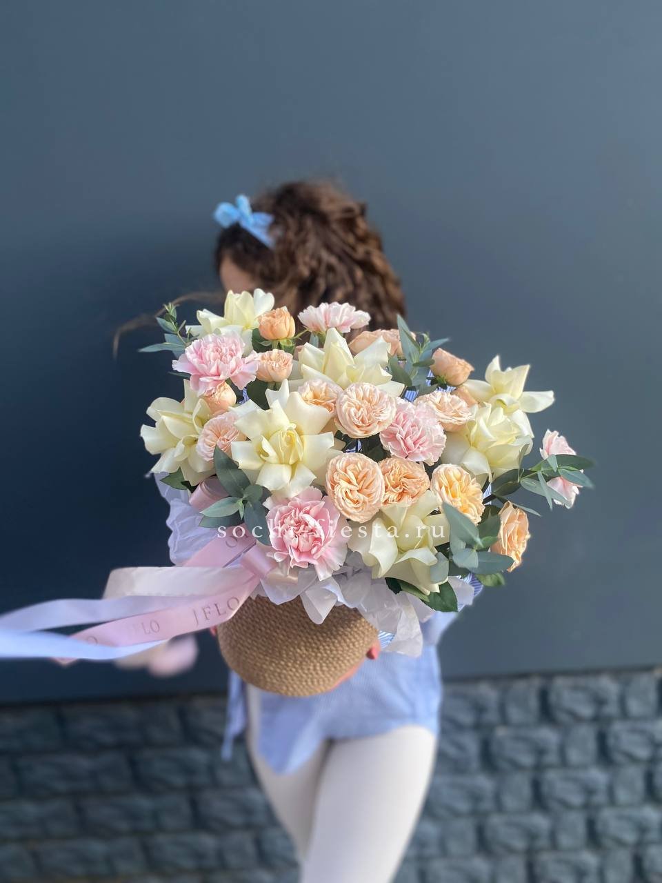 Состав: белые и кустовые розы, диантус в джутовом кашпо с эвкалиптом