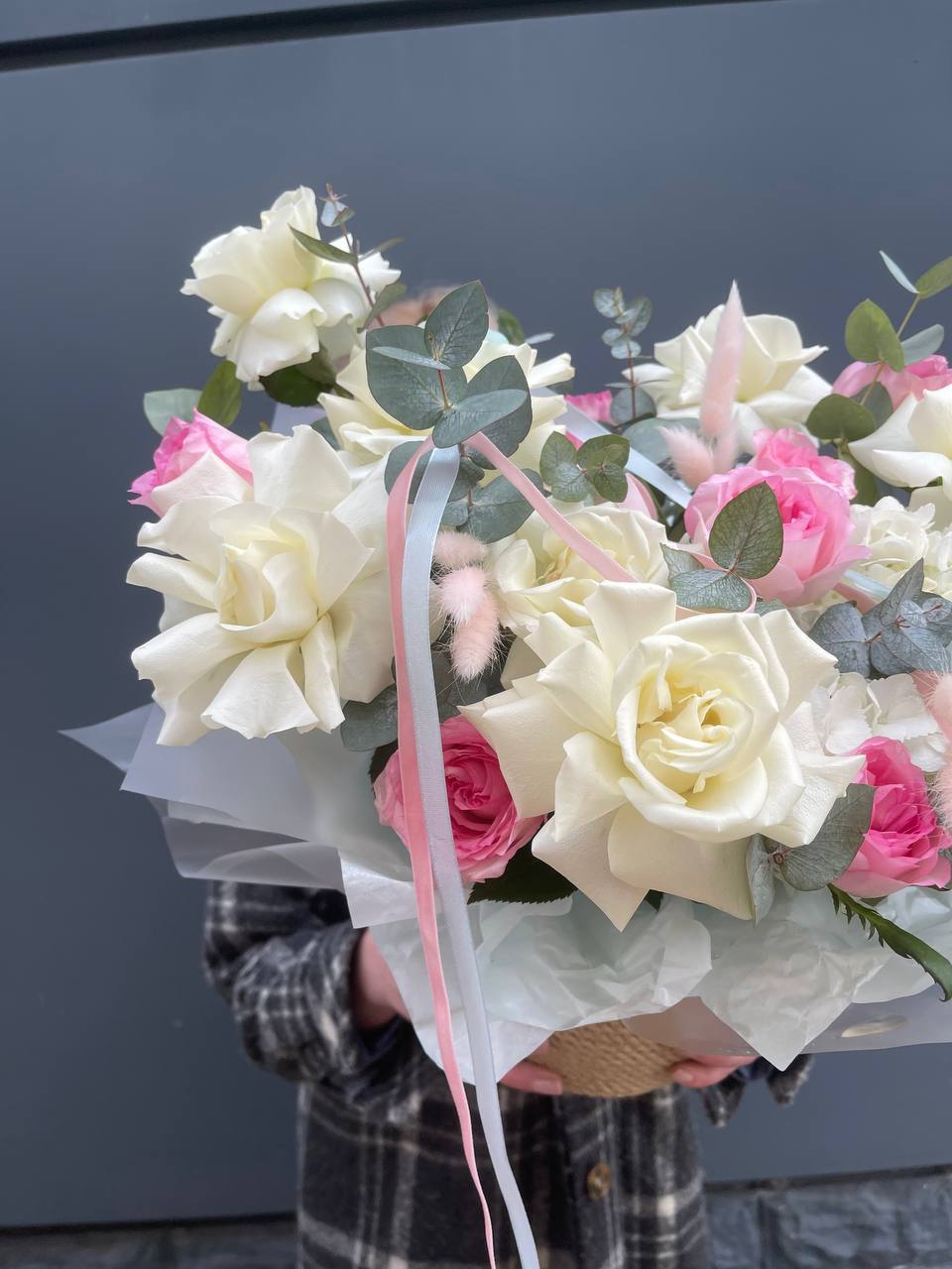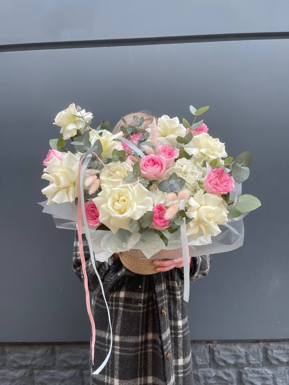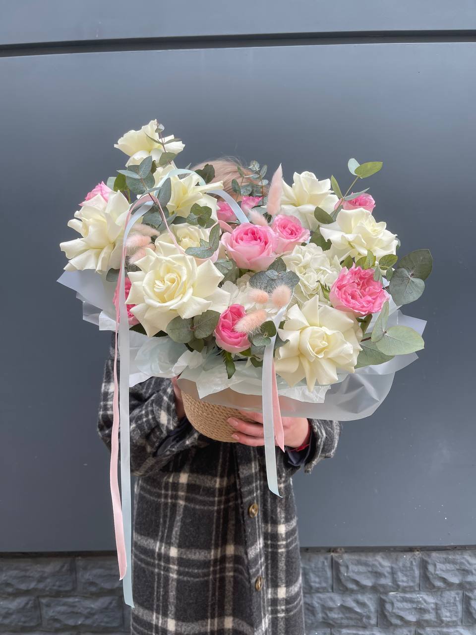 Воздушная гортензия окружает розы пудровых и снежных оттенков, а эвкалипт добавляет глубину и свежесть. Композиция собрана в натуральное джутовое кашпо, которое удобно разместить на столе или подоконнике.