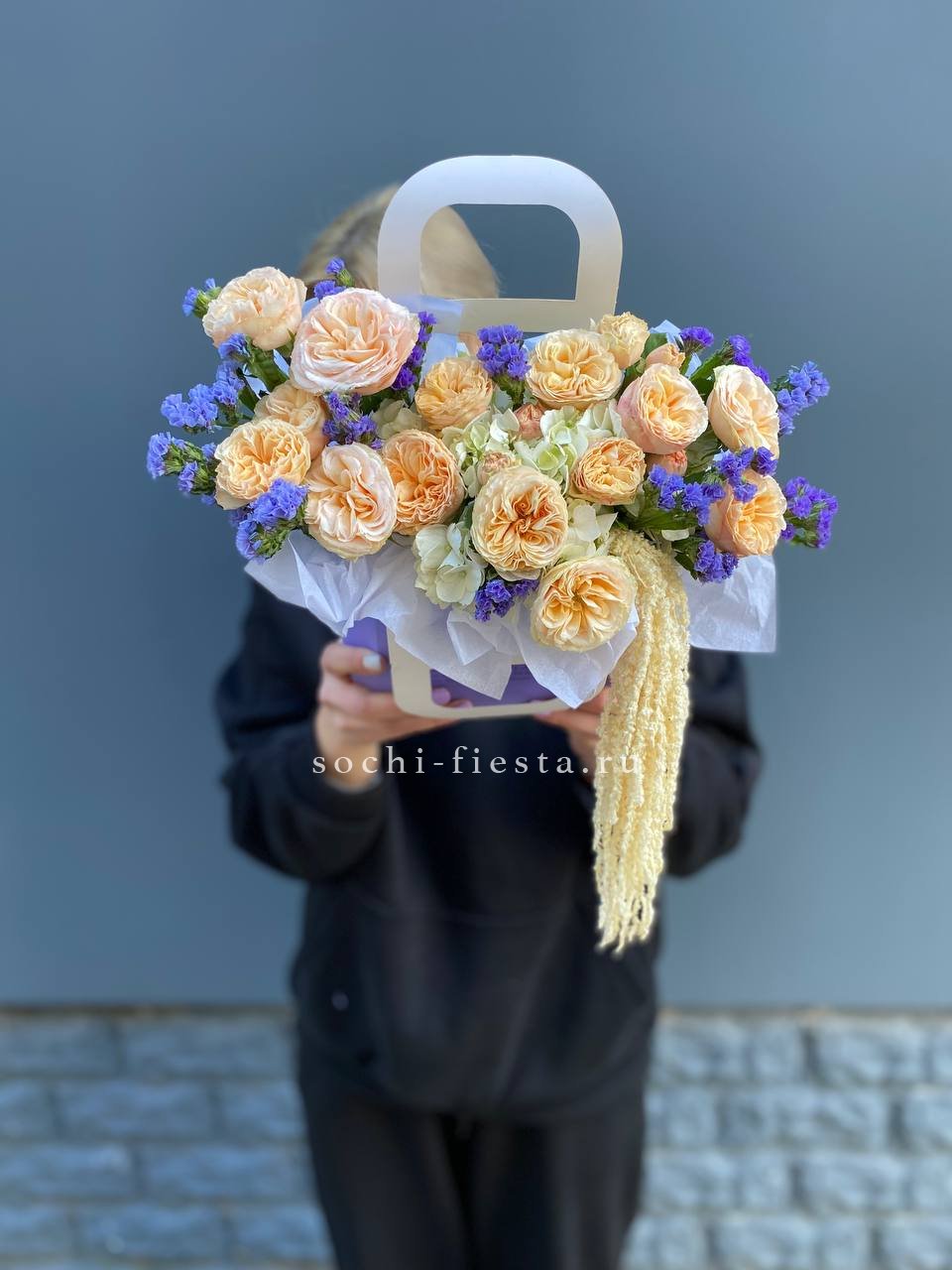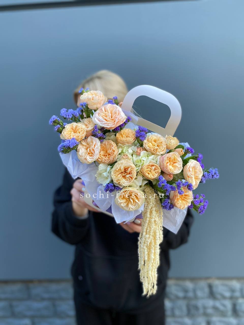 Состав: сумочка из кустовых роз, гортензии и статицы.