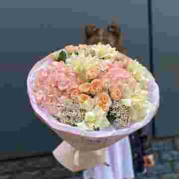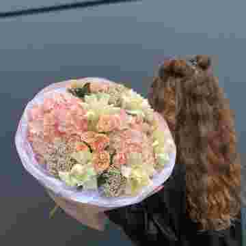 Состав: джумилия, гербера, мисти баблс, диантус, хлопок, лагурус, сумочка
