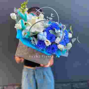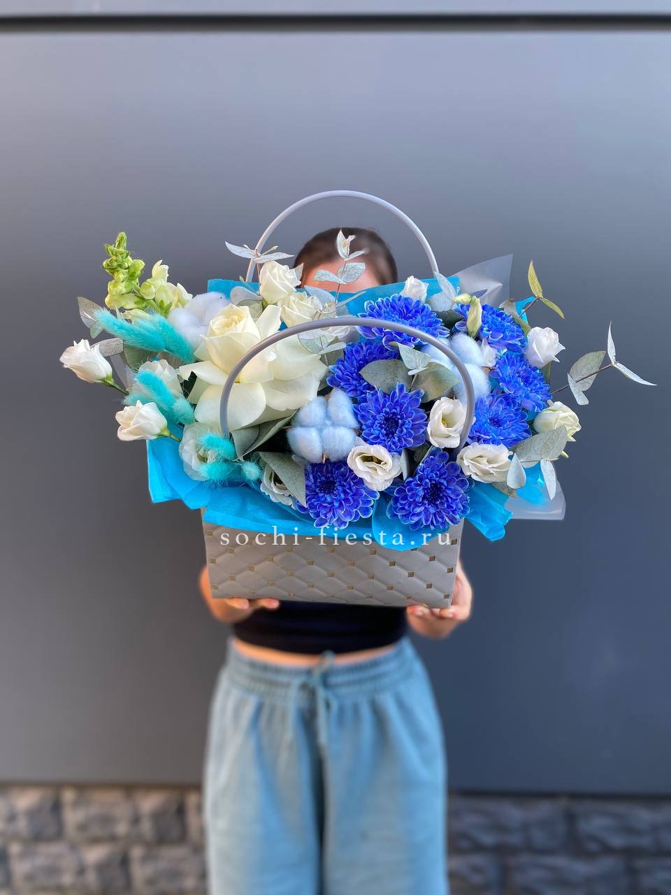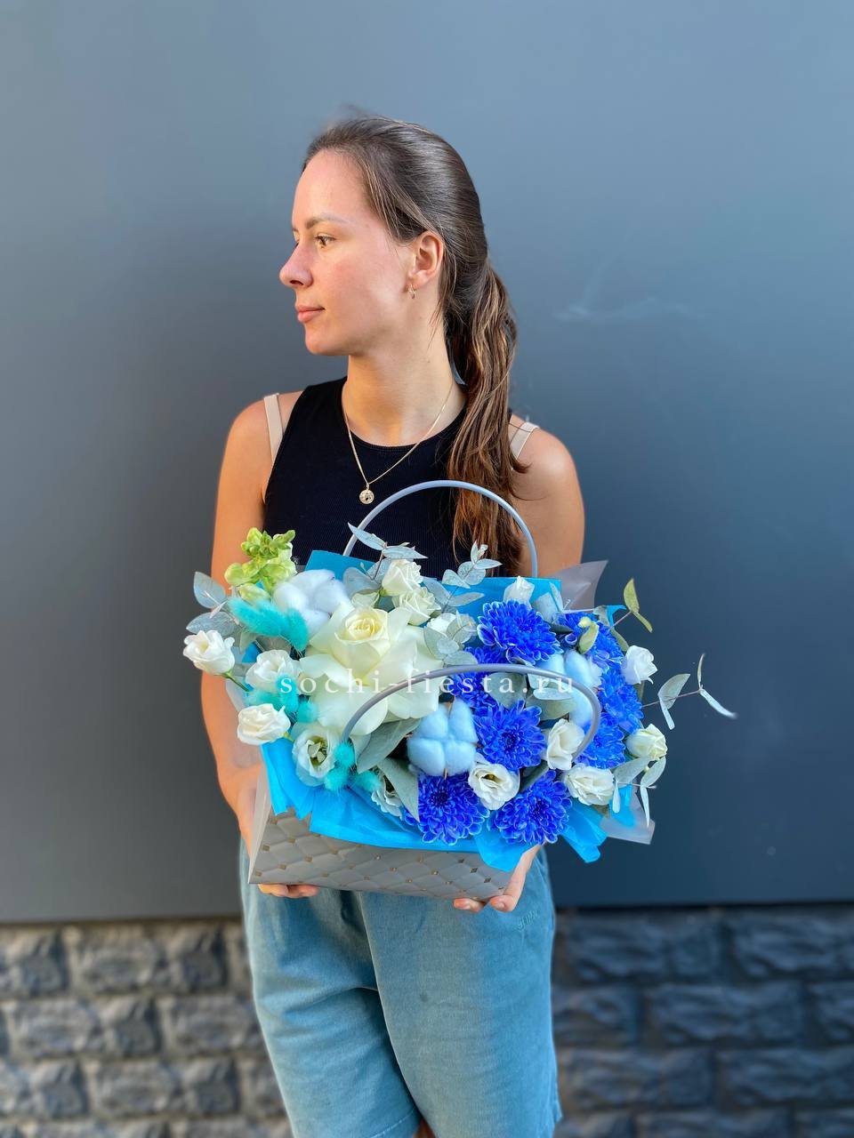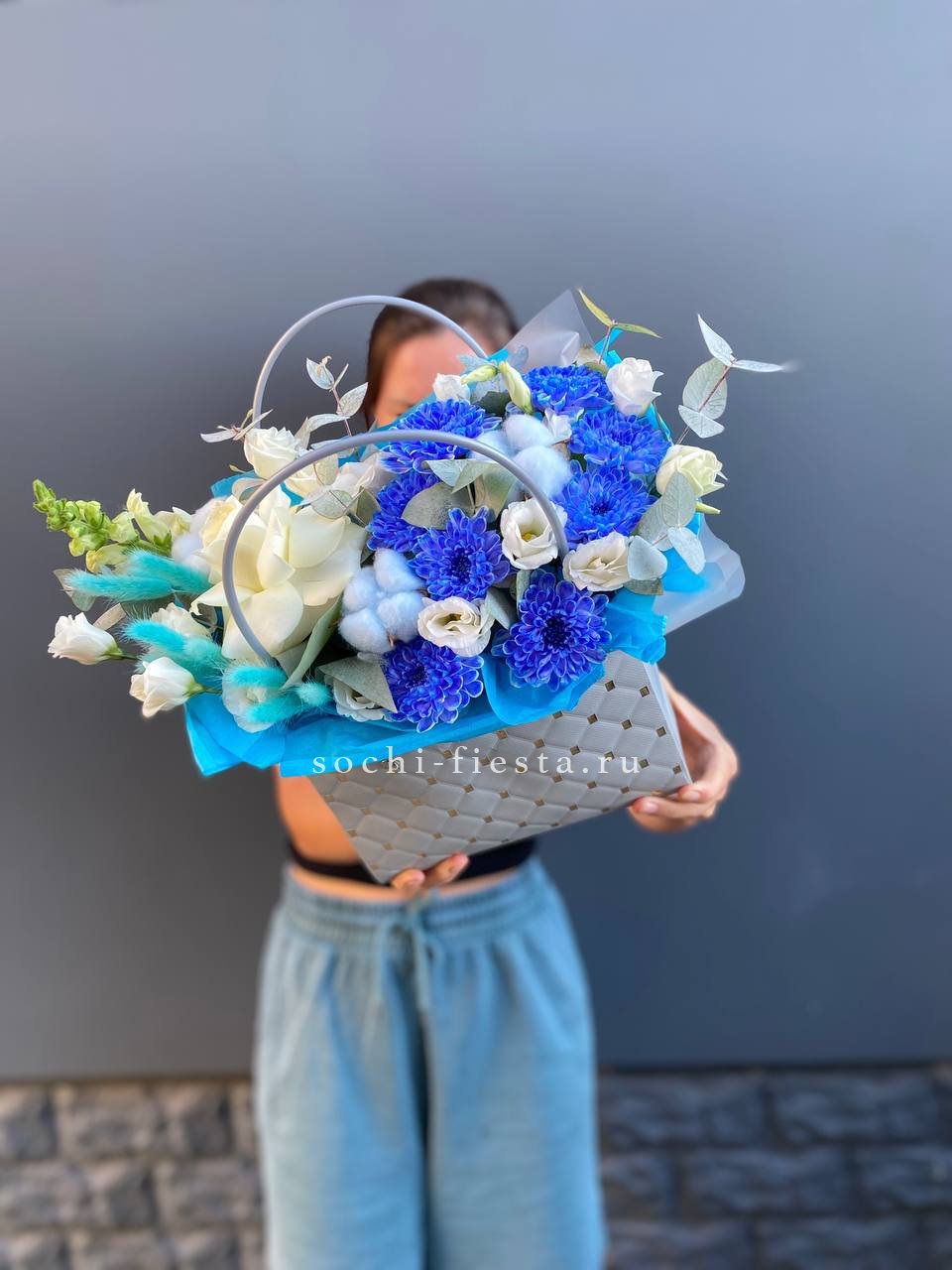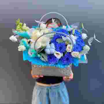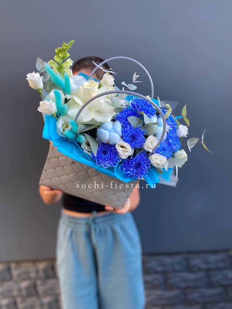 Состав: белая роза, хризантема, хлопок, эустома, антиринум, сумочка