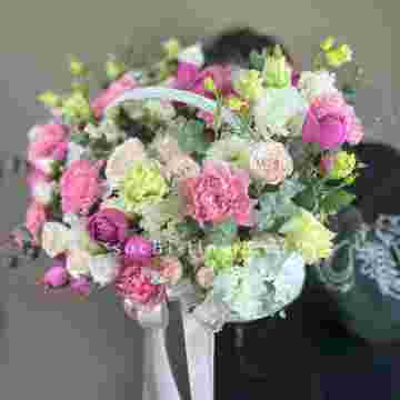 Состав: мисти баблс, бомбастик, эустома, диантус, эвкалипт, корзина маленькая