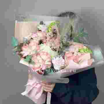 Состав: пионовидная кустовая роза Мисти Баблс - 51 шт., эвкалипт 5 шт., хаммелациум (или аналог), лента, дизайнерская упаковка