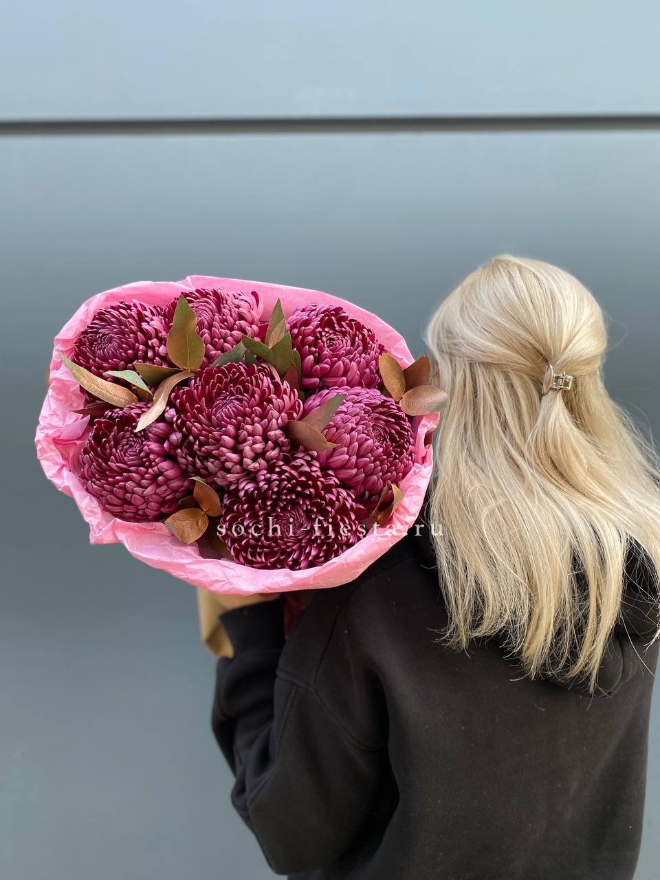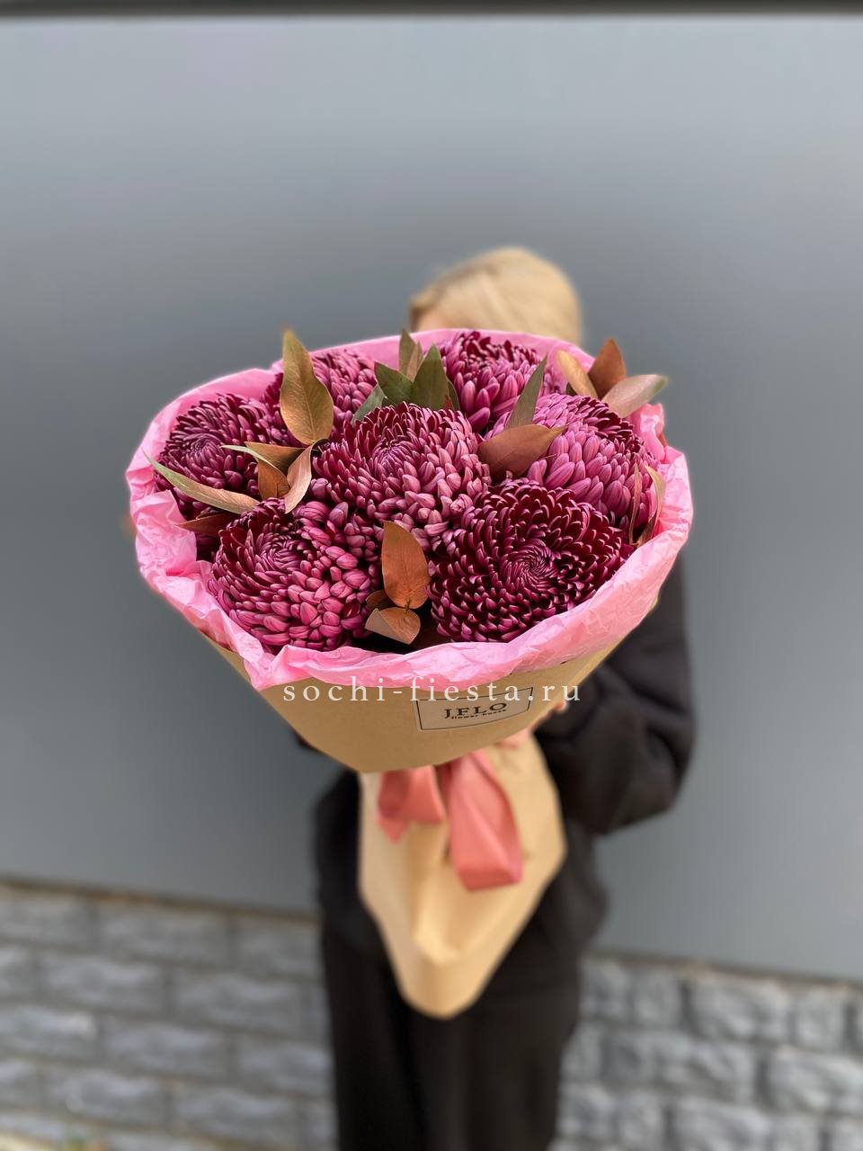 Состав: хризантема бигуди с золотым эвкалиптом в оформлении.