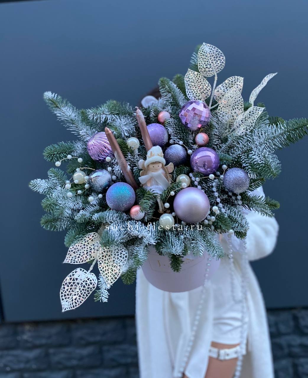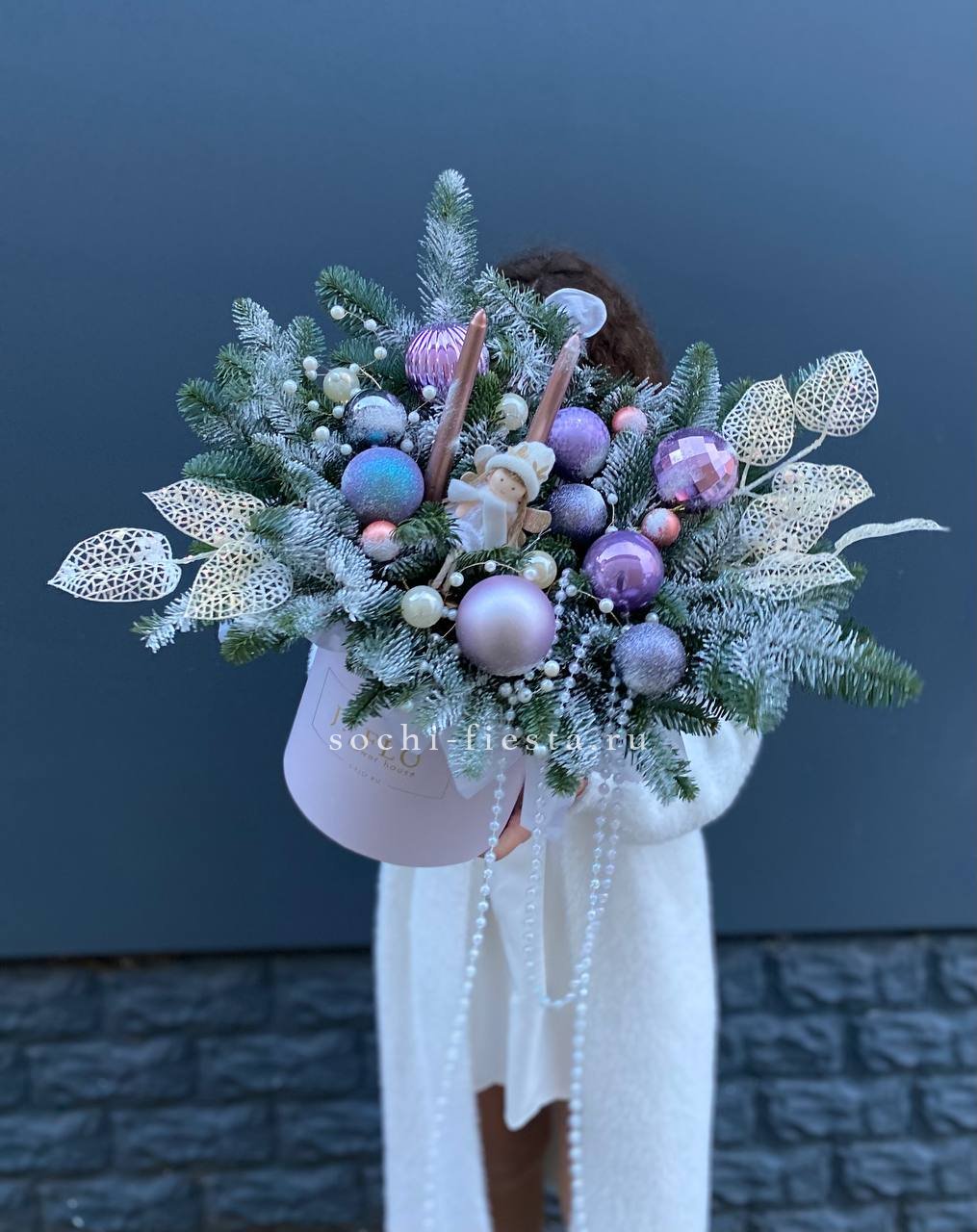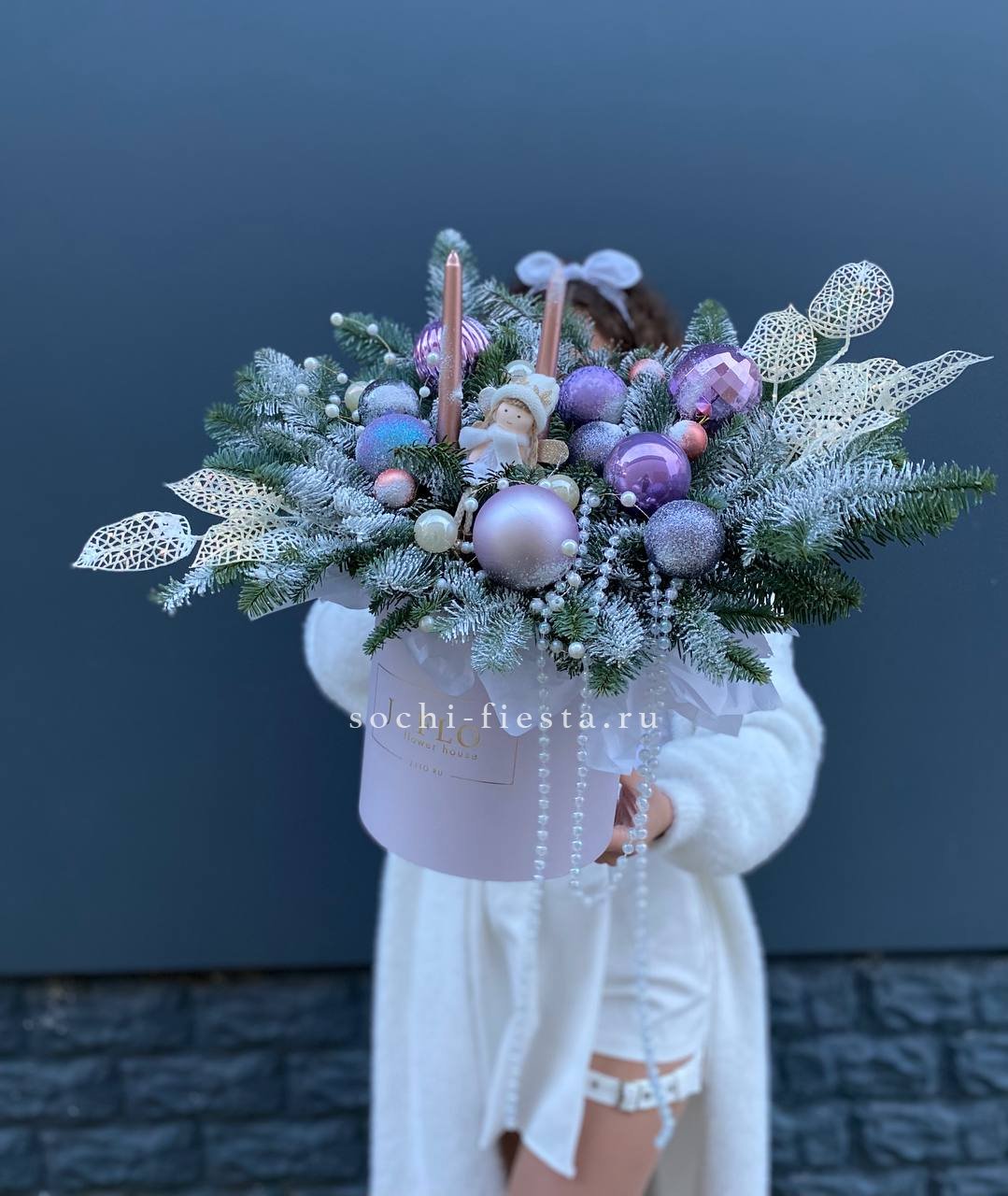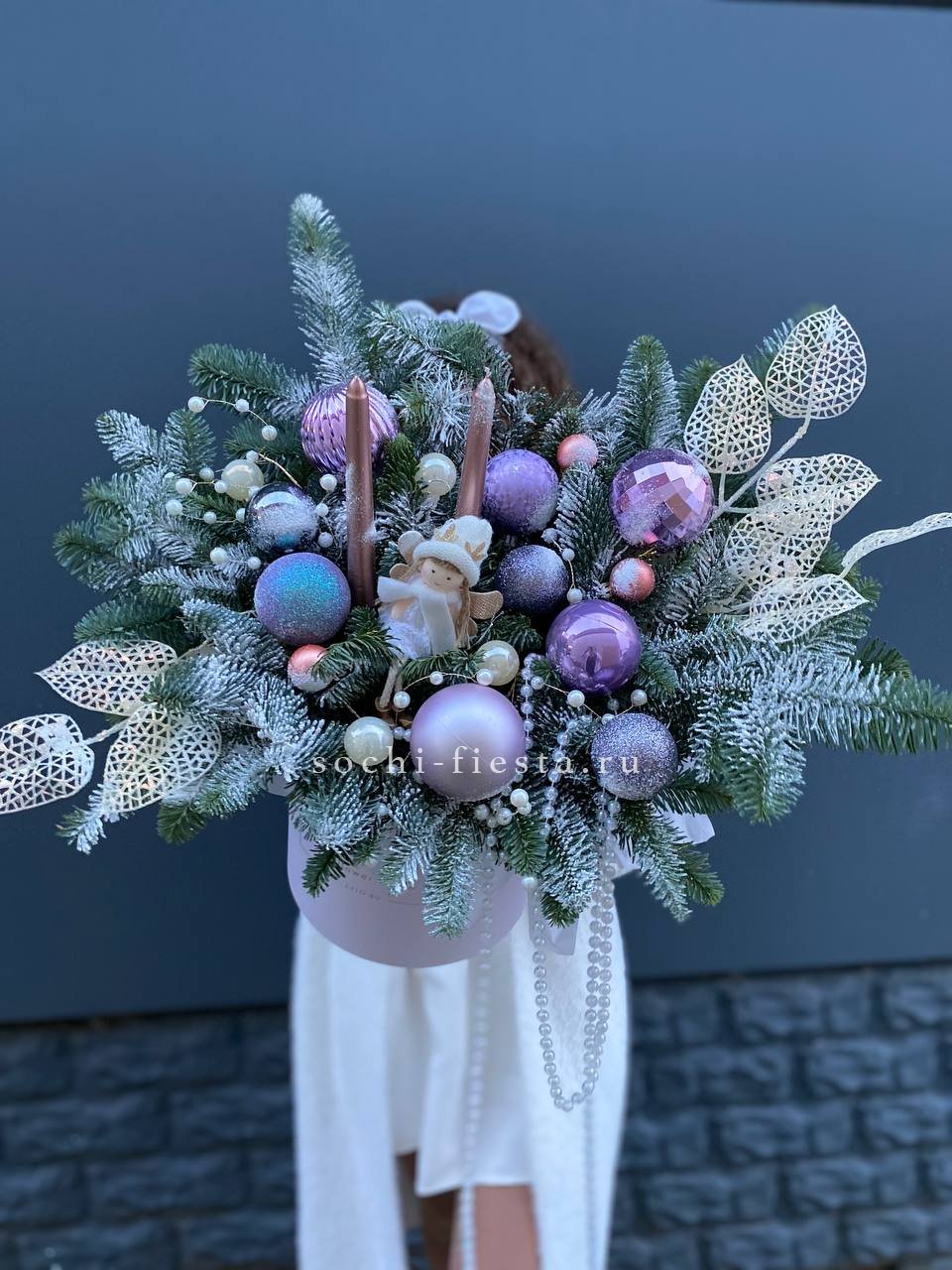 Состав: нобилис, цилиндр, оазис, свечи, новогодние игрушки, декор