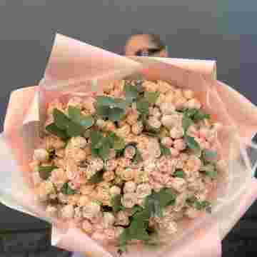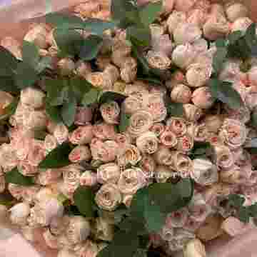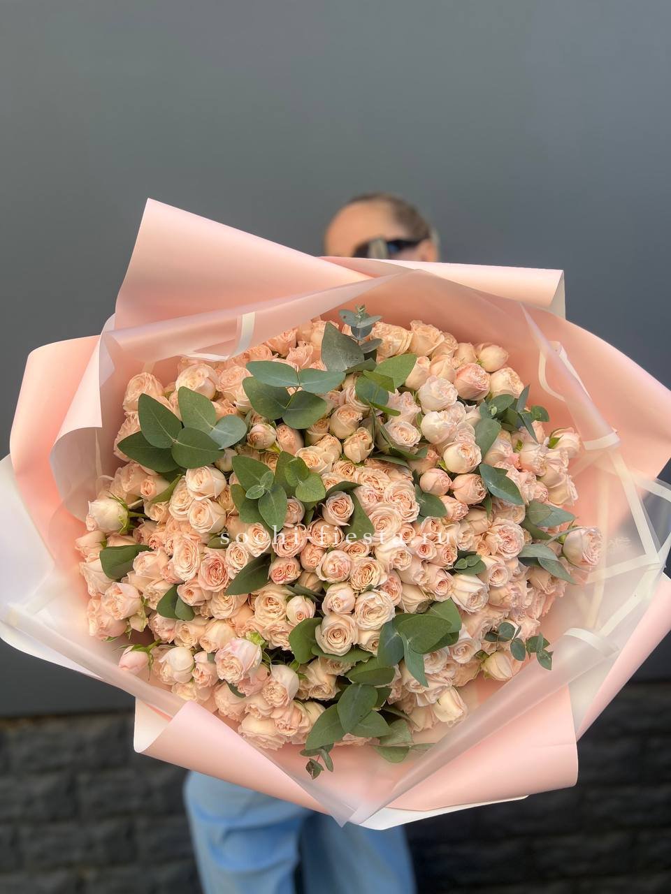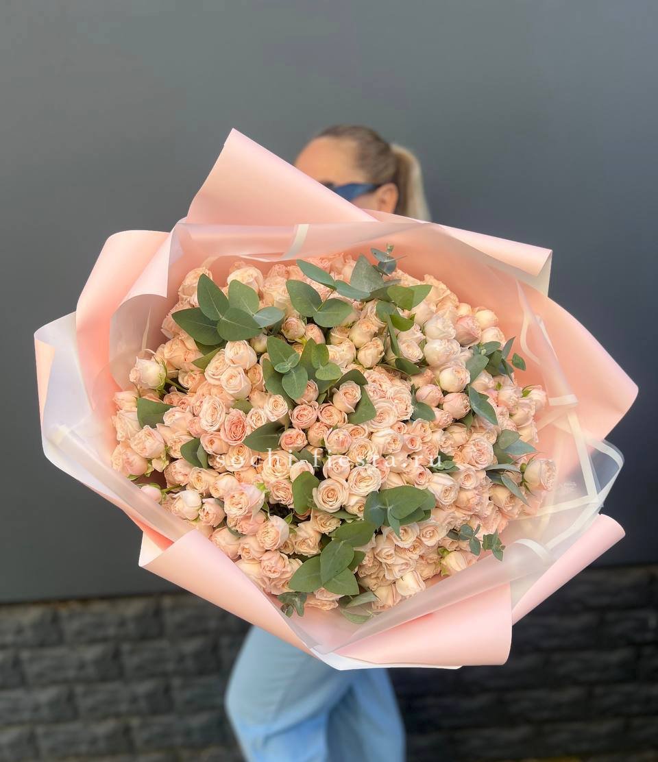 Состав: 101 кремовая кустовая роза, эвкалипт, лента, дизайнерская упаковка