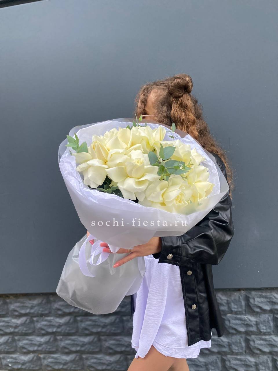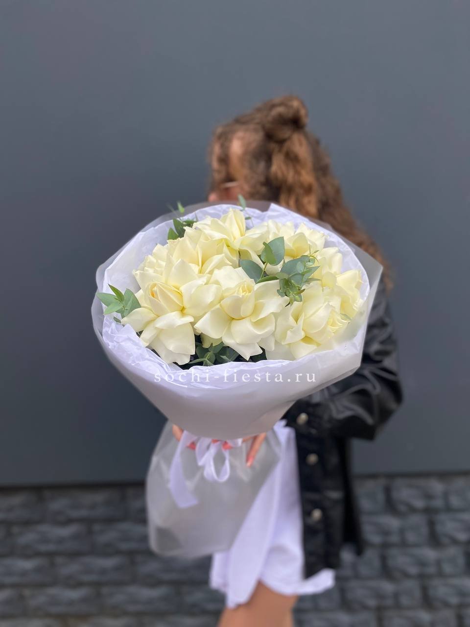 Состав букета на фотографии: вывернутые розы - 7 шт., эвкалипт - 2шт., лента, авторская упаковка