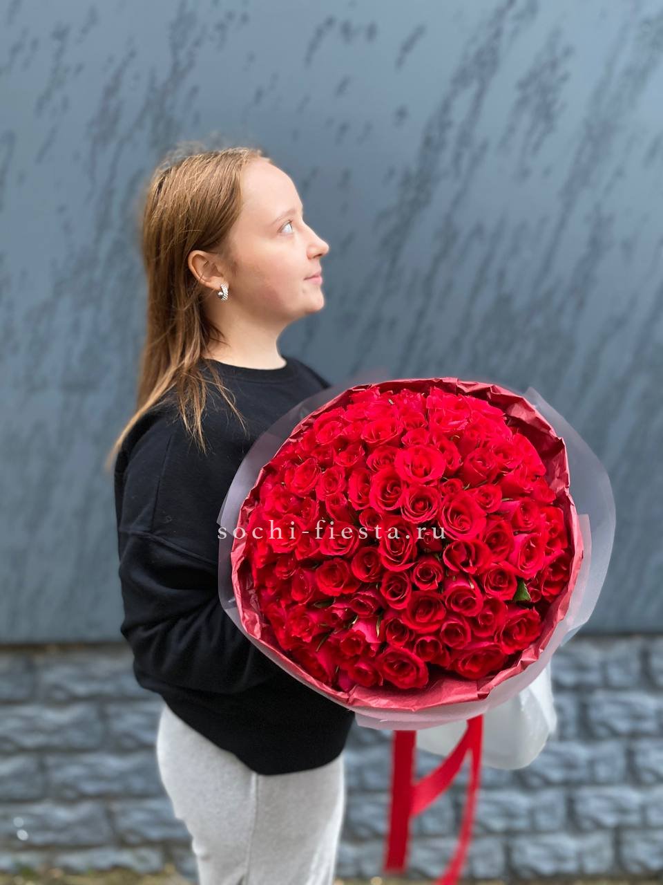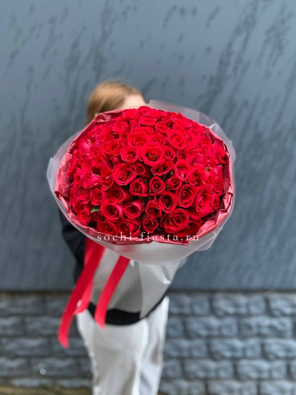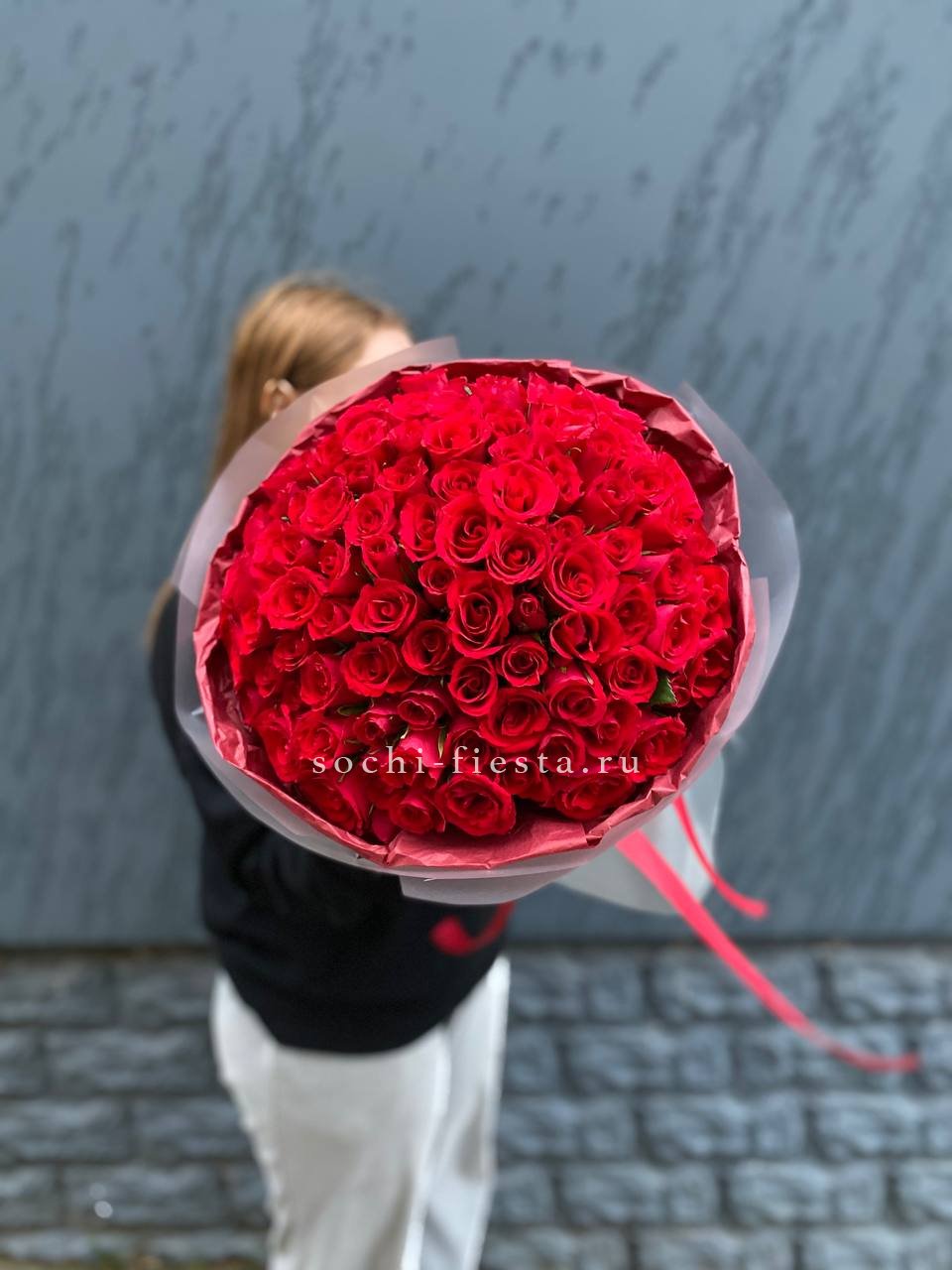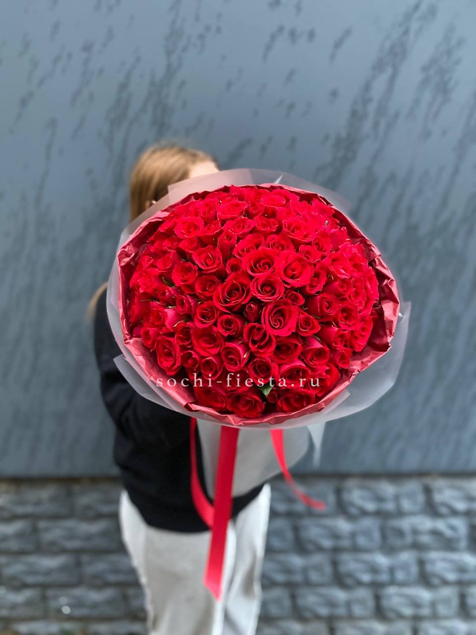 Состав букета на фотографии: 101 кенийская роза (35-40 см), лента, упаковка