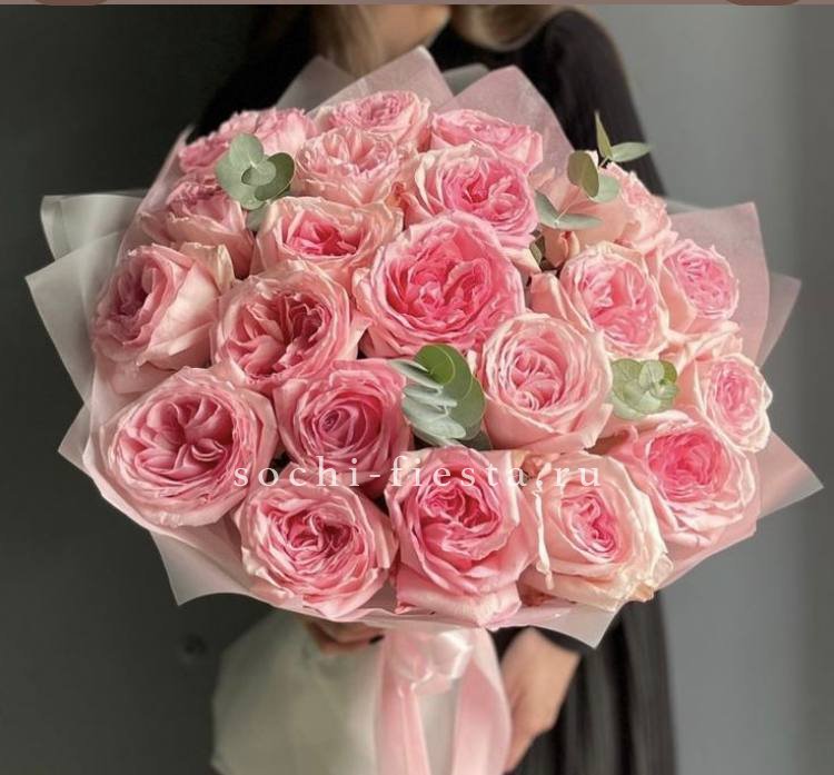 Состав: розы пионовидные 21шт, эвкалипт, пленка, лента